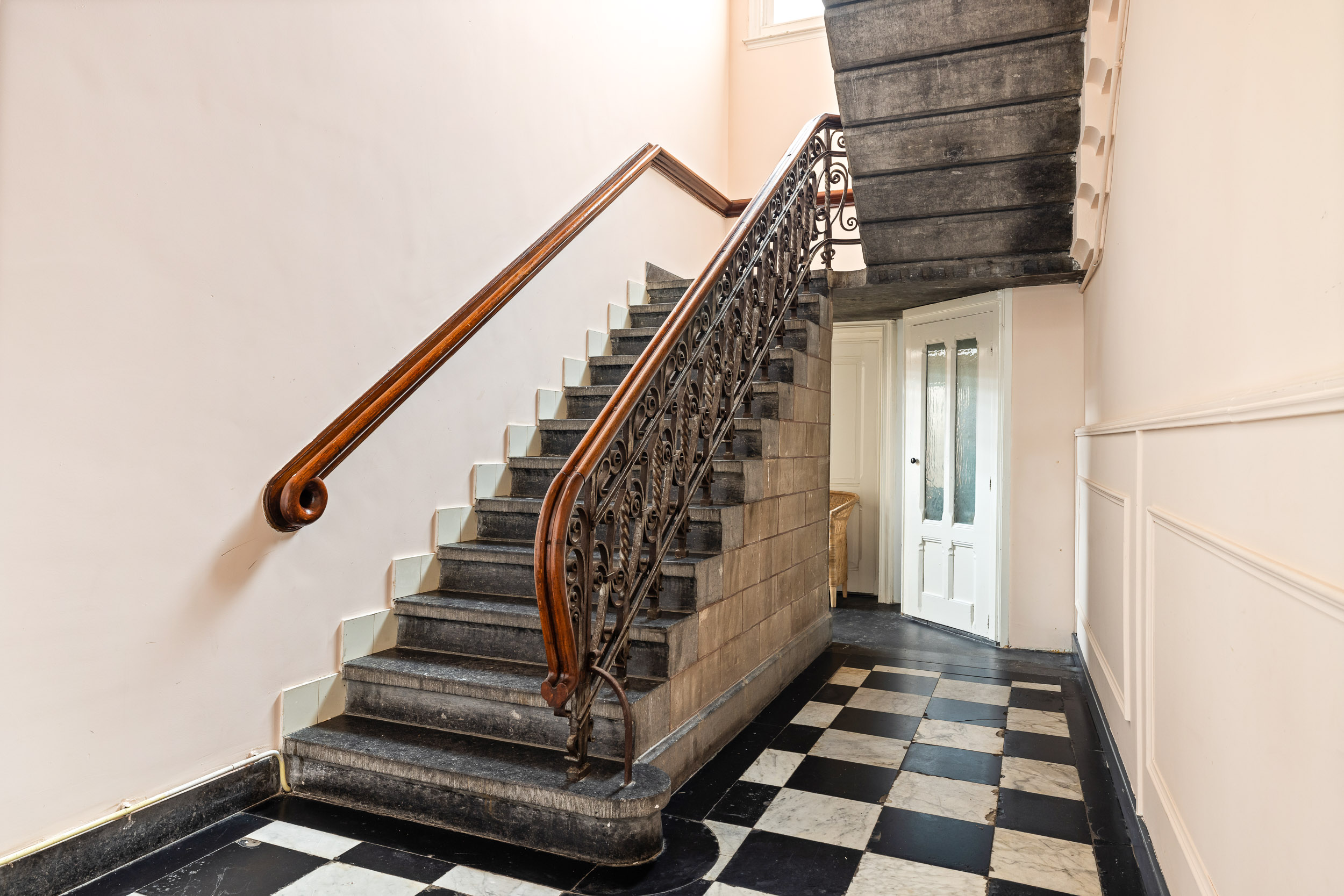 De monumentale bordestrap van natuursteen met gietijzeren balusters leidt naar de eerste verdieping, die grotendeels de originele indeling heeft behouden. Op de overloop geeft een rijk gedecoreerde houten deur toegang tot de betegelde gang. Aan de rechterzijde bevinden zich de kamers en suite, met schuifdeuren voorzien van koperen sluitwerk uit de geelgieterij van Joure. Originele details als plafonds met geometrisch lijstwerk, rozetten, parketvloeren en de zwarte marmeren schouw zijn hier prachtig bewaard gebleven. Het aan de woonkamer gelegen dakterras aan de tuinkant biedt gezien de omvang (45m2) volop mogelijkheden (zie artist impressie).