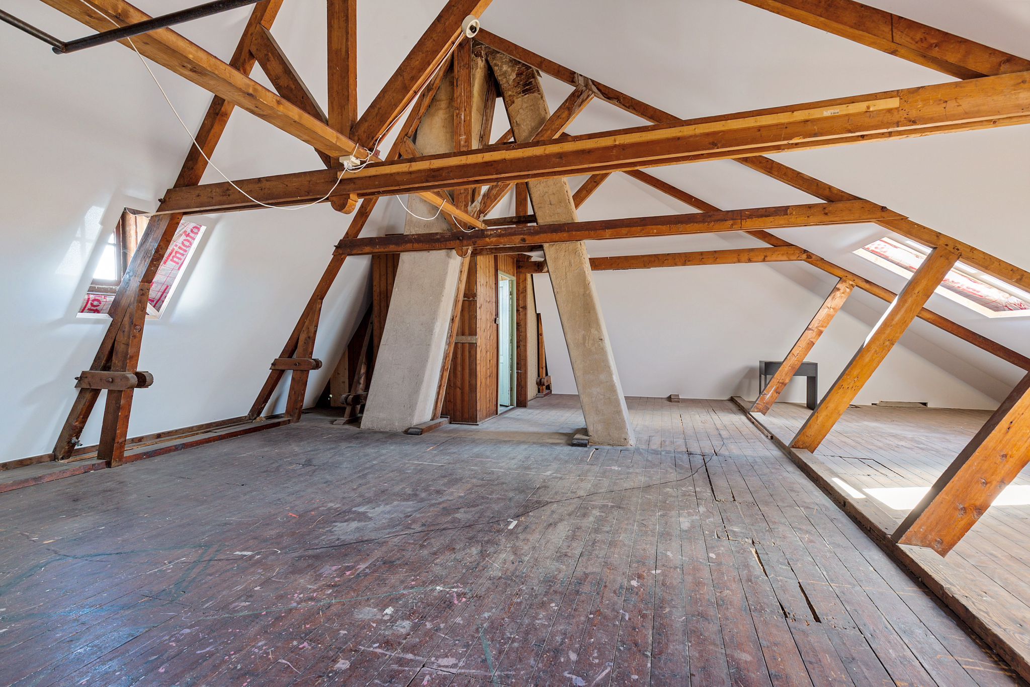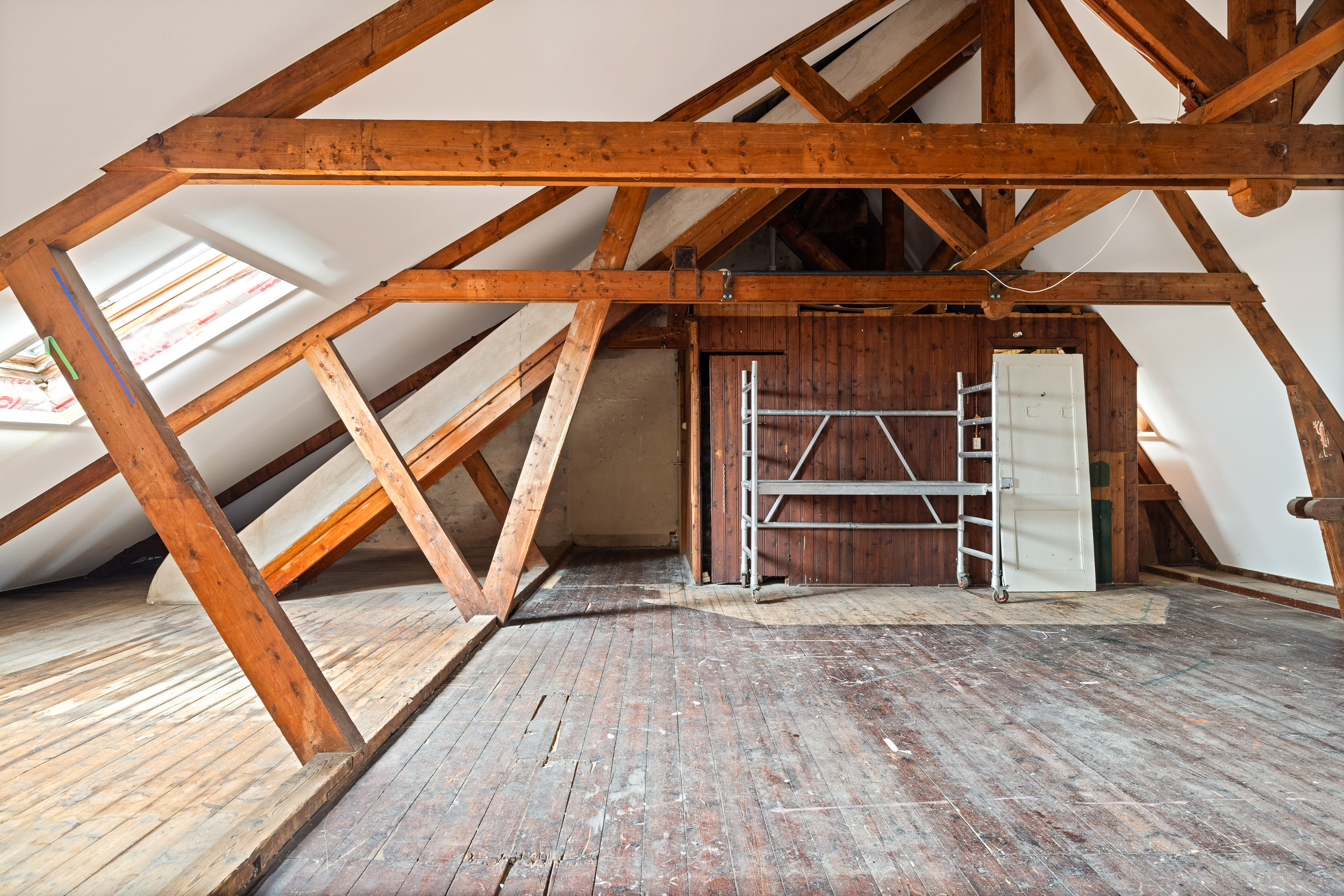De royale zolderverdieping van 85 m², volledig geïsoleerd en met imposante houten spanten, verkeert in originele staat en heeft volledige stahoogte. Via een vaste trap bereikbaar, biedt deze verdieping ruimte voor de creatie van een stijlvol loftappartement (zie artist impressie).