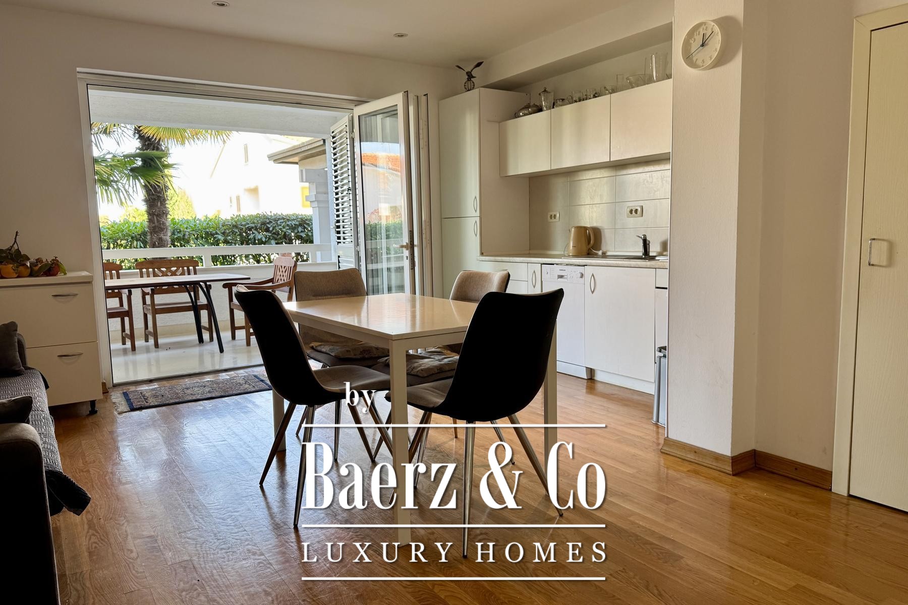 apartment consists of a bedroom, bathroom, kitchen, living room and terrace.Another additional apartment is located in the basement of the house and has two bedrooms, a kitchen, a bathroom and a storage room.There is also a garage in the yard of the house, and the garden itself is full of beautiful Mediterranean plants.Four more cars can be parked in the yard.For any additional information, feel free to contact us!