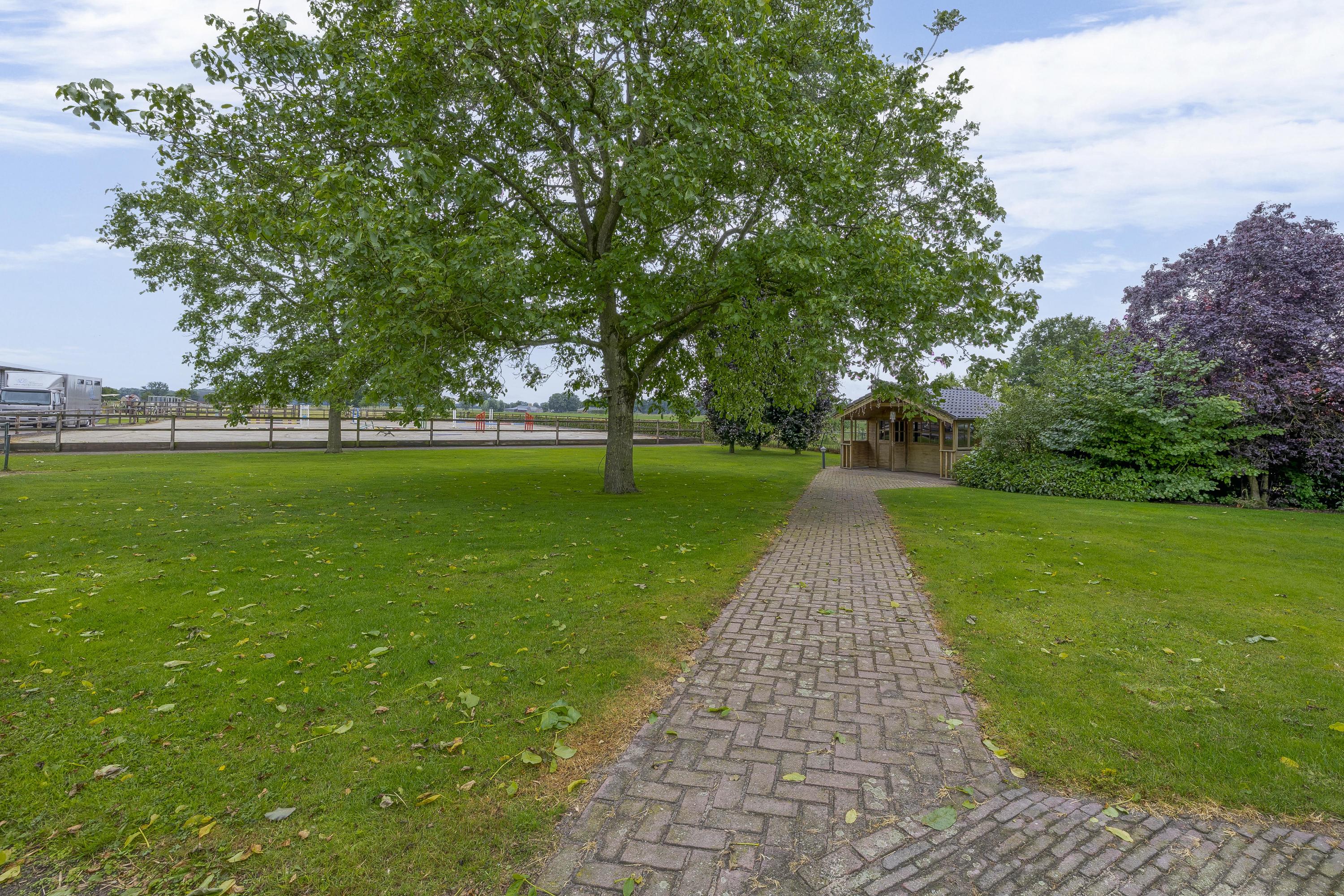 De tuin is voorzien van een royaal overdekt terras met glazen schuifwanden, zodat u het hele jaar door kunt genieten van het buitenleven. Vanuit het terras heb je een fraai uitzicht op de tuin en zelfs op de buitenpiste. Daarnaast is er een tuinhuis, een uitgestrekt gazon en diverse volwassen bomen en struiken aanwezig. Voor extra gemak beschikt de tuin over een beregeningsinstallatie. Het erf is grotendeels voorzien van betonklinkers. Een gedeelte, de weg tot aan de garage is afgewerkt met gebakken klinkers. Het deel vanaf de weg, naast de stal en tot aan de achterzijde van de stal is voorzien van gebroken asfalt. Er zijn 2 opritten aanwezig, er is een aparte oprit die toegang biedt tot de accommodatie.