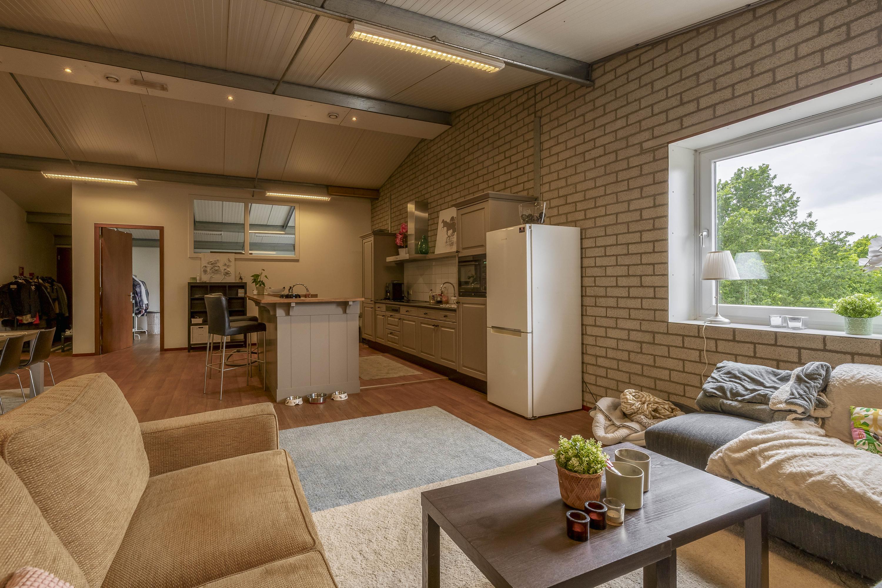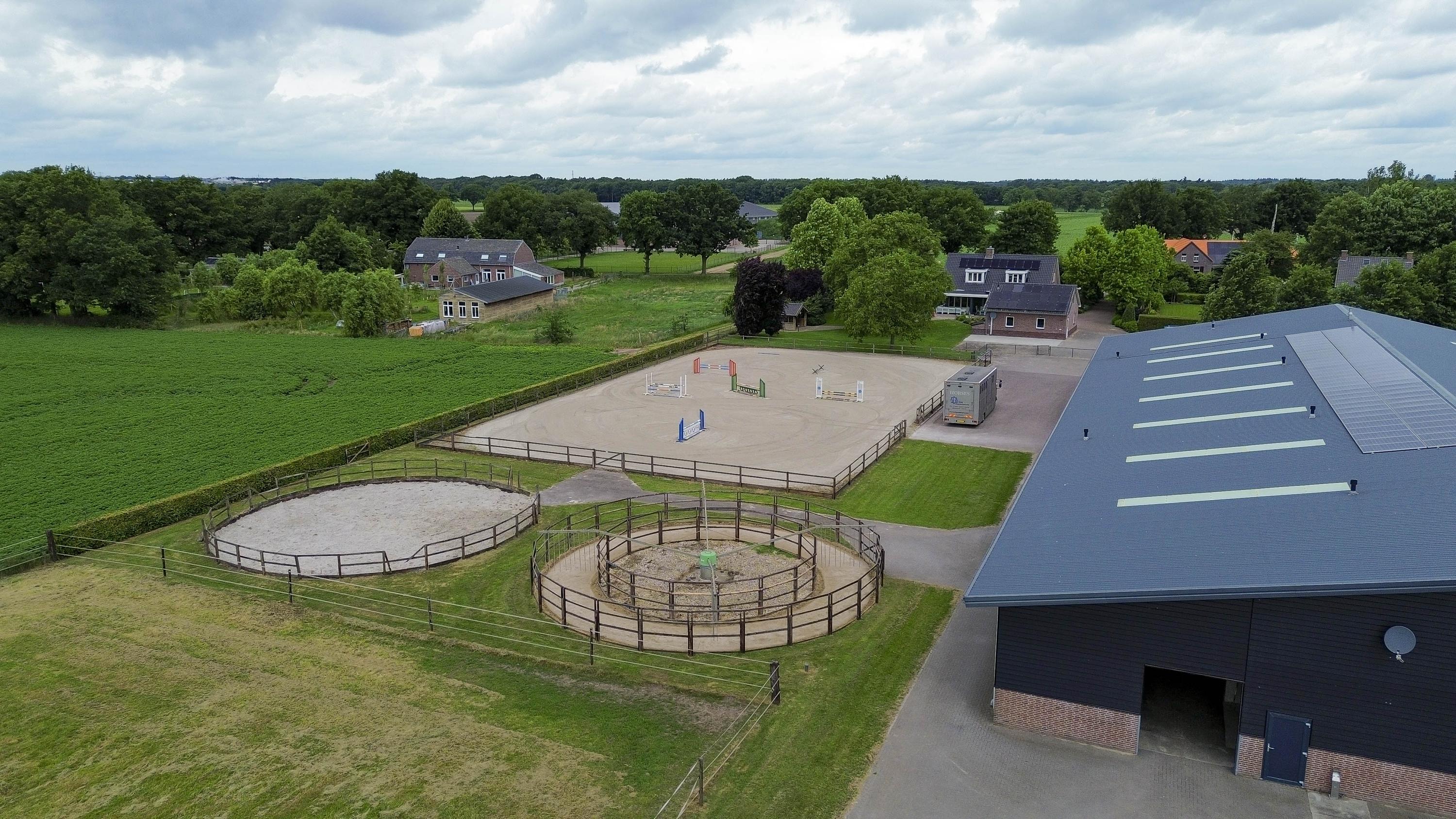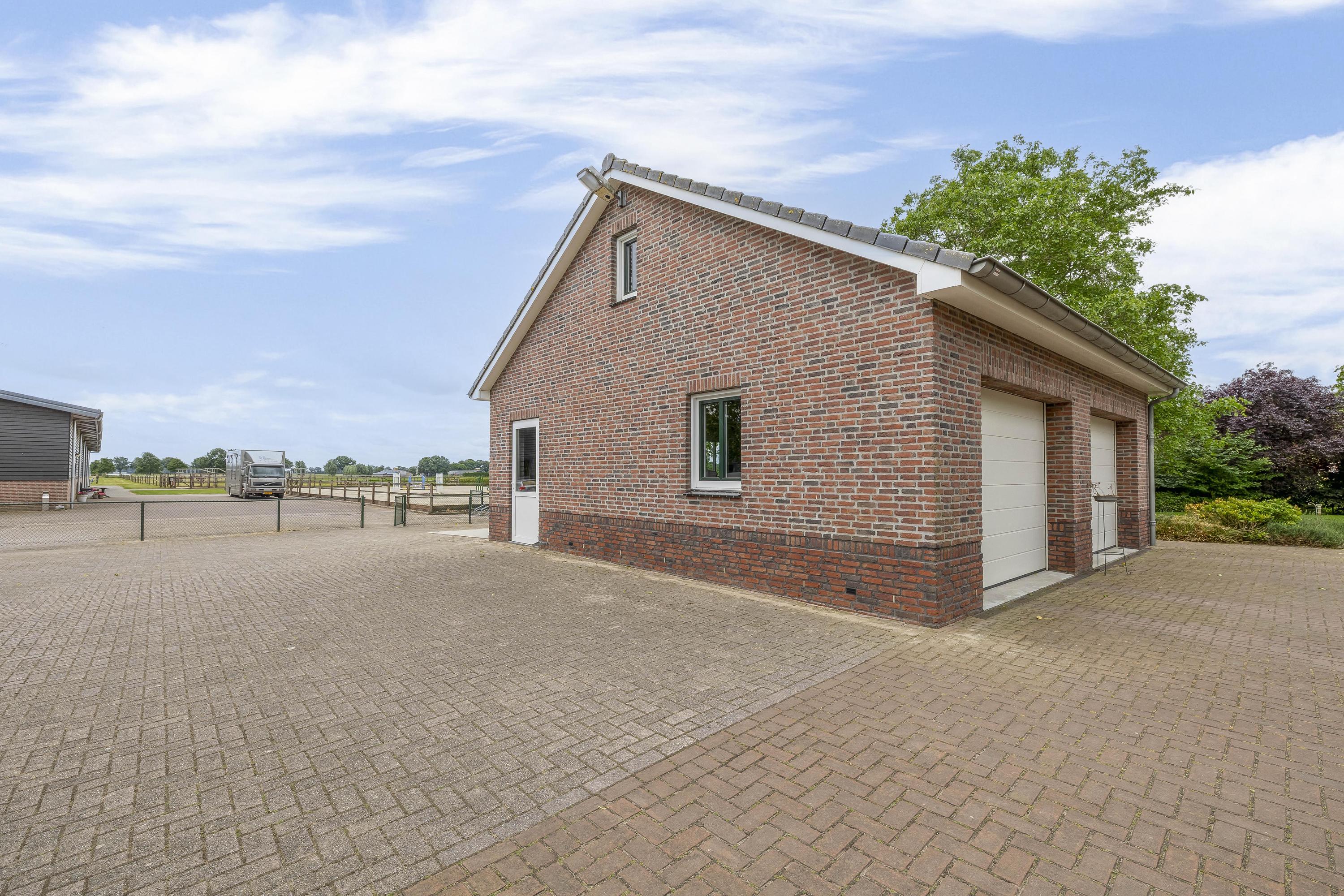 De goed onderhouden hippische accommodatie bestaat uit een vrijstaande rijhal met een binnenpiste (ca. 20x40 mtr.), een stalgedeelte met in totaal 20 paardenboxen, een ontvangstruimte met appartement, een 2e appartement en een loods/werkplaats.. Het erf is verder ingericht met een buitenpiste, 6 buitenstallen, een stapmolen, een longeercirkel, weiland, een mestvaalt. De rijhal is opgetrokken uit metselwerk gevels, stalen spanten en een geïsoleerd dak. De gevels zijn aan de buitenzijde deels gepotdekseld. Lichtdoorlatende platen zorgen voor natuurlijke lichtinval. Aan de binnenzijde zijn de gevels voorzien van betonelementen. De binnenpiste heeft een afmeting van ca. 20mtr. x 40mtr. en is uitgerust met een eb-vloed bodem. Er is een heather aanwezig. De piste is voorzien van verlichting. De wanden zijn van beton. Een roldeur in de achtergevel en een loopdeur in de zijgevel zorgen voor toegang. Het stalgedeelte is uitgerust met maar liefst 20 paardenboxen, waarvan de voorwanden deels zijn uitgevoerd in kunststof en deels in gegalvaniseerd staal. De boxen hebben betonnen tussen- en achterwanden en zijn voorzien van schuifdeuren. Aan de voorzijde van de hal is de loods/werkplaats gelegen welke is voorzien van een betonnen vloer en wanden en een betonplaten plafond. Aan de rechterzijde is de vaste trap gesitueerd naar de ontvangstruimte en het appartement op de 1e verdieping. De ruime ontvangstruimte is voorzien van een PVC-vloer en deels metselwerk/ deels stucwerk gevels. Er is een keukenblok gesitueerd welke is uitgerust met een gootsteen en een koelkast en bergruimte. De slaapkamer beschikt over dezelfde afwerking als de ontvangstruimte. De badkamer is uitgerust met een douche en een wastafel. Ook is er een zwevend toilet aanwezig. Vanuit de ontvangstruimte is er een fraai zicht op de binnenpiste. In de berging zijn de aansluitingen voor de wasapparatuur, de unit voor de vloerverwarming, de opstelling voor de CV-ketel (Nefit Topline) en de omvormer voor de zonnepanelen gesitueerd. De stro opslag aan de achterzijde van de rijhal is afgewerkt met een betonnen vloer. De voersilo is hier gesitueerd. Een roldeur aan de achtergevel en een loopdeur zorgen voor toegang tot het erf. Het dak is geïsoleerd.