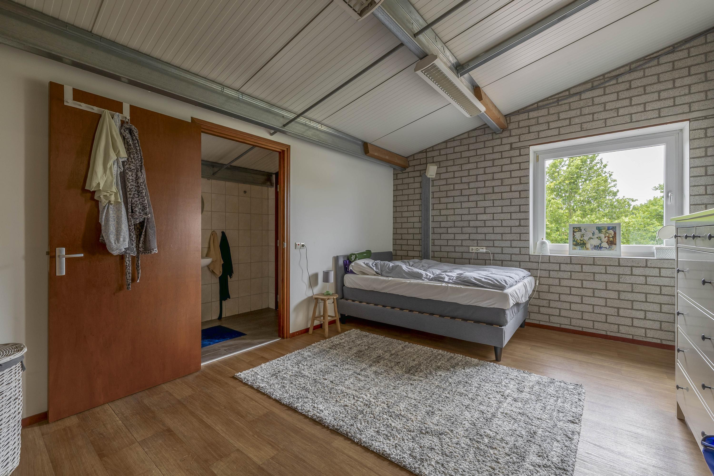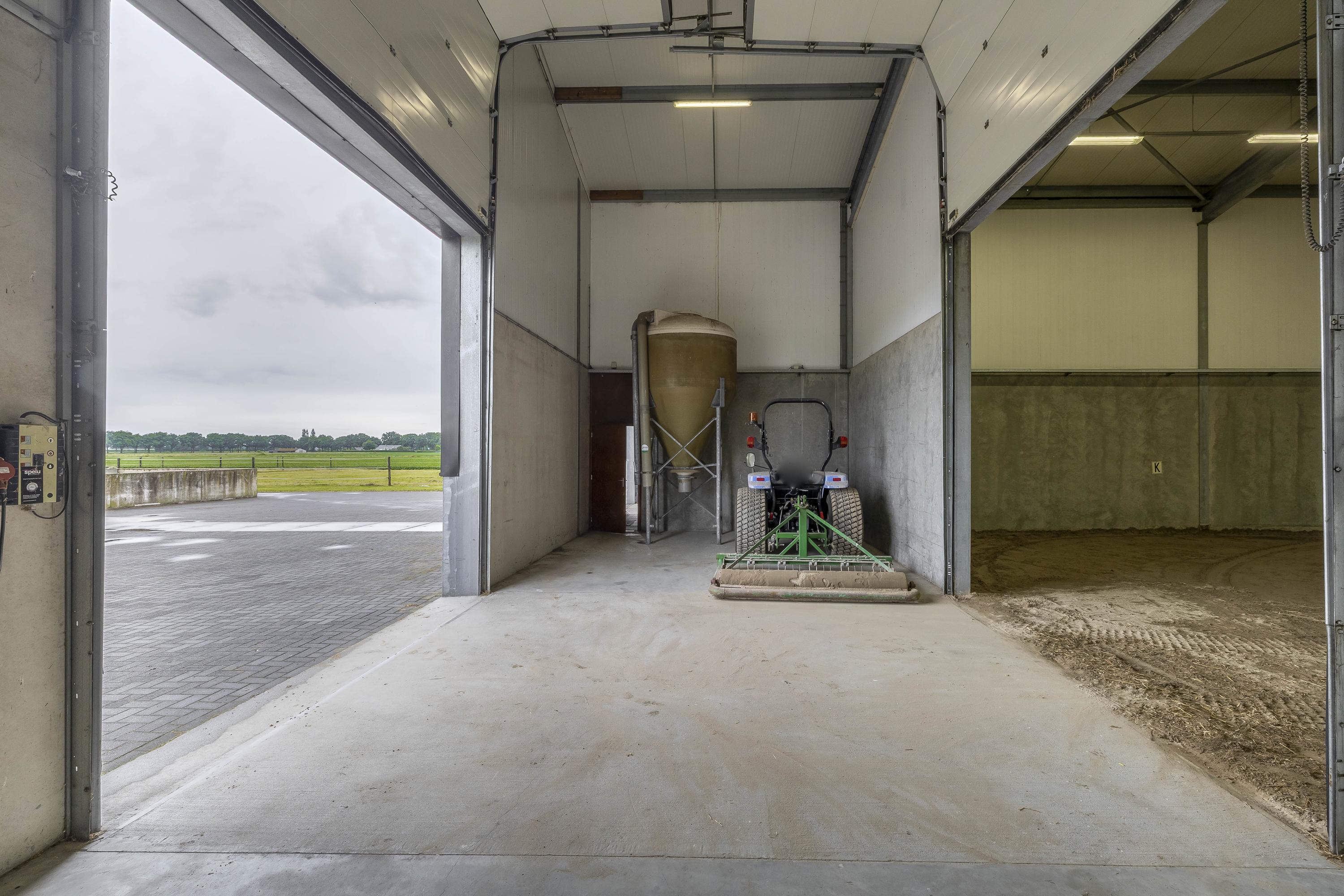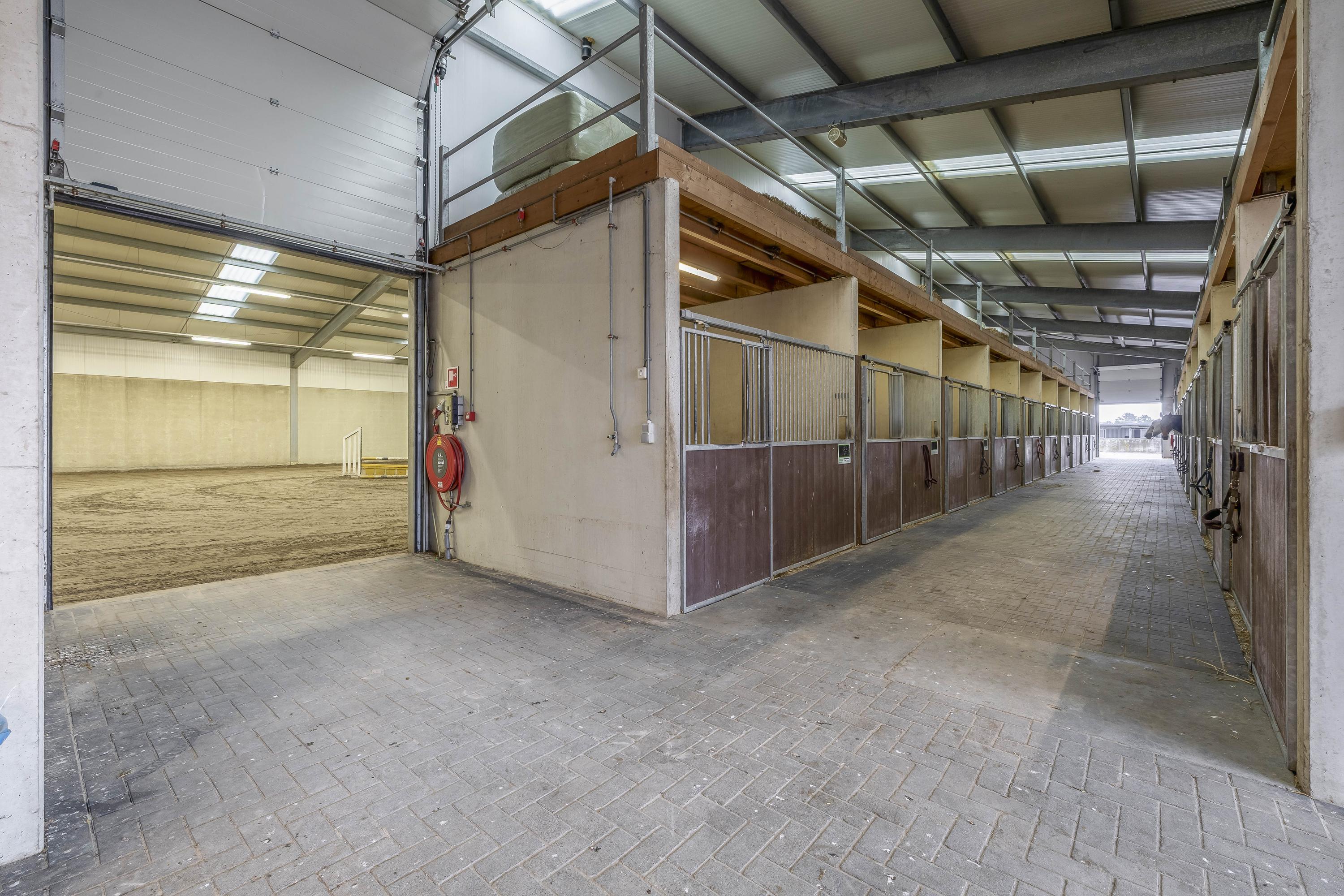 Middels een loopdeur is er toegang tot de stal. Een roldeur zorgt dan weer voor toegang tot de binnenpiste. Er zijn praktische magazijnopstellingen opstellingen gesitueerd. Er is krachtstroom aanwezig en een hogedrukleiding voor het reinigen van de stallen. Een elektrische roldeur en een loopdeur zorgen voor toegang tot het erf. Openslaande deuren zorgen voor toegang tot de rijhal. Daarnaast zijn 10 boxen uitgerust met praktische buitenluiken. Een groot voordeel is de hooizolder met handige hooiluiken, strategisch boven de stallen geplaatst, waardoor hooi en stro eenvoudig direct in de boxen kunnen worden gegooid. Verder draagt de aanwezige sleepketting voor de mest bij aan extra gemak en efficiëntie in het onderhoud van de stallen. Naast de stallen is een douche- en toiletruimte voor heren en dames gesitueerd. Ook zijn er 3 wasplaatsen aanwezig, welke zijn voorzien van een warm- en koud watervoorziening. Via een separate ingang, gelegen naast de zadelkamer is het appartement bereikbaar. Het appartement is afgewerkt met een vinylvloer, deels metselwerk / deels stucwerk wanden en een systeemplafond. Er bergruimte onder de dakschuinte gecreëerd. De woonkamer van het appartement is uitgerust met een keukenblok. Vanuit deze ruimte is er zicht op de binnenpiste. De slaapkamer is voorzien van een praktische inbouwkast. De badkamer is ingericht met een douche, wastafel en een toilet en is geheel betegeld.