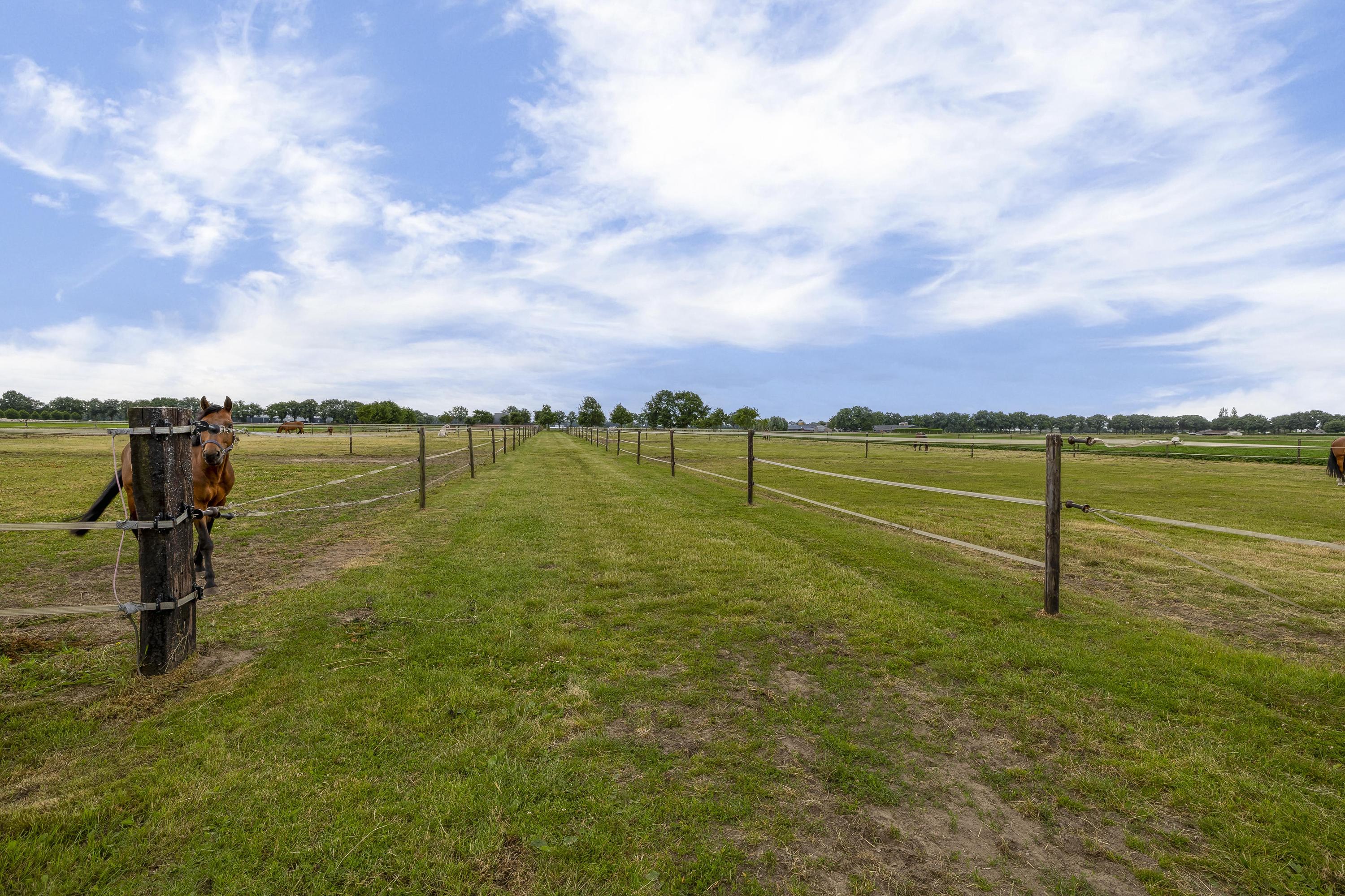 Het erf is verder ingericht met een buitenpiste, een praktische stapmolen en een longeercirkel. Daarnaast zijn er 6 buitenstallen, een mestvaalt en een opslagruimte voor stro aanwezig. Het geheel wordt verder aangevuld met een royaal weiland verdeeld in verschillende paddocks. Deze uitgebreide faciliteiten zorgen ervoor dat het geheel volop mogelijkheden biedt voor de (semi)professionele paardenliefhebber! De buitenpiste heeft een afmeting van ca. 50mtr. x 25mtr. is uitgerust met een eb/vloedbodem en voorzien van een houten omheining. De longeercirkel is omheind met hout en verder voorzien van een eb/vloed bodem. De stapmolen is geschikt voor 4 paarden en is uitgerust met een betonnen vloer en een houten omheining. Op het terrein zijn 6 buitenstallen gesitueerd. Deze stallen zijn voorzien van deels kunststof/ deels gegalvaniseerde voorwanden met een schuifdeur. Het dak is bedekt met damwand. De mestvaalt is verdiept gelegen, uitgerust met een betonnen vloer en wanden. Toevoer geschiedt via de mestketting. Toegang via de helling. Het weiland is verdeeld in paddocks, welke zijn omheind met houten palen en lint. Er is een middenpad aanwezig zodat je gemakkelijk de verschillende paddocks kunt bereiken.