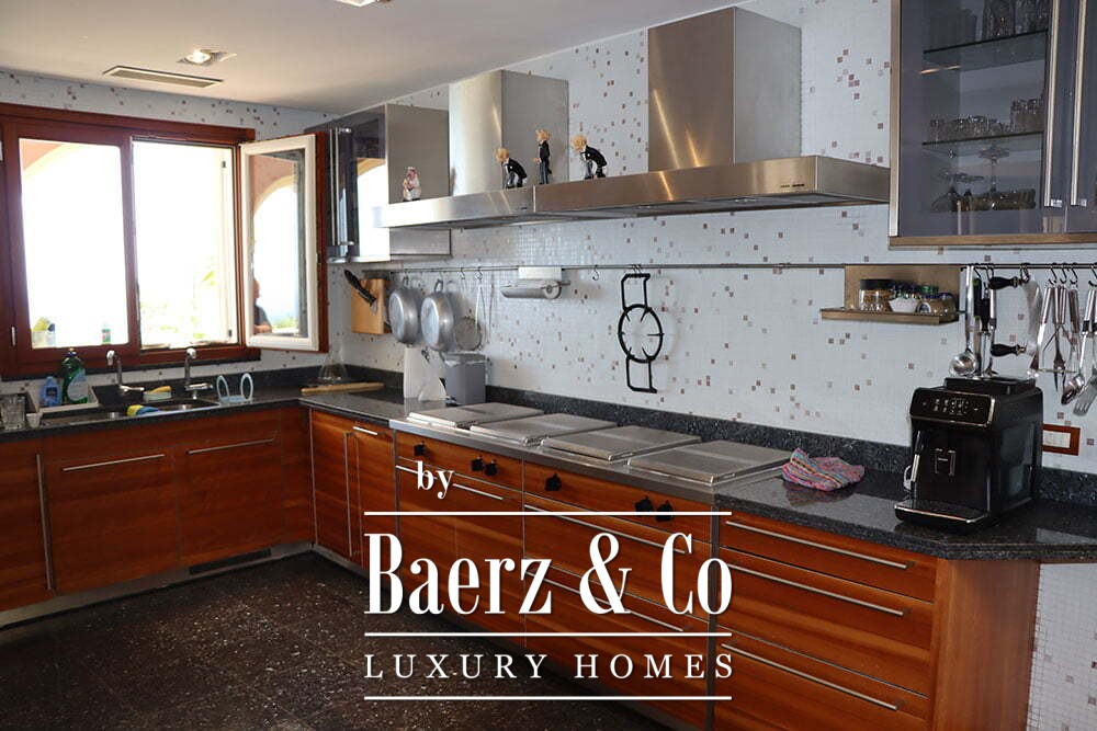 De begane grond draait om een royale woonkamer, waar de open, professionele keuken naadloos aansluit op de eetkamer. Hiernaast bevindt zich een wintertuin met een tweede keuken en barbecue, omsloten maar toch open en uitkijkend op het spectaculaire zeezicht. Praktische voorzieningen zijn onder meer een ruime garage voor meerdere auto's, een aparte douche bij het zwembad en een wasruimte. De begane grond sluit direct aan op een portico die toegang geeft tot de terrassen en het verwarmde infinity-zwembad dat in het horizonbeeld opgaat.