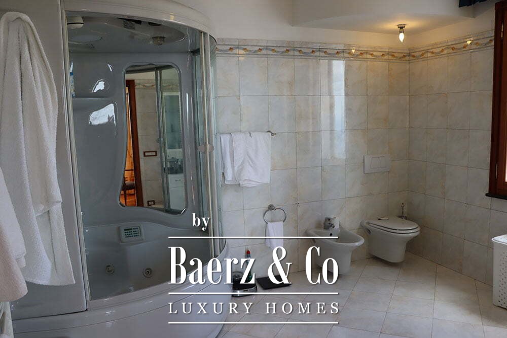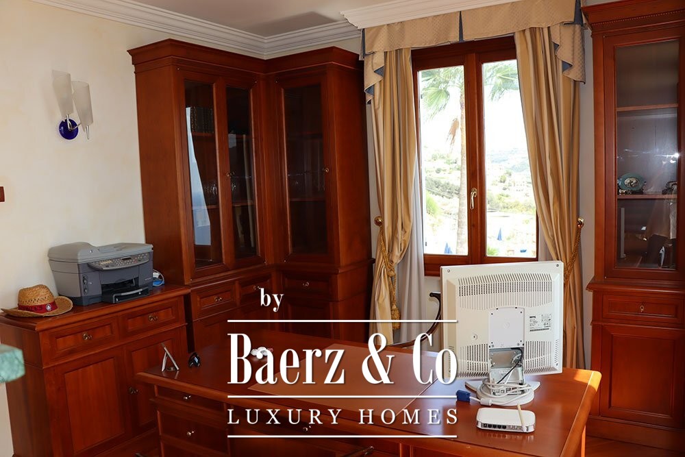 De eerste etage biedt acht slaapkamers en zes badkamers. De master suite beschikt over een werkkamer, een inloopkast, een ruime ensuite badkamer met jacuzzi en privétoegang tot het terras. De villa ligt op een perceel van 2.000 m² en combineert privacy met moeiteloos gastheerschap. Dit object biedt een uniek perspectief voor wie waarde hecht aan het mediterrane licht en de kustelijke rust.