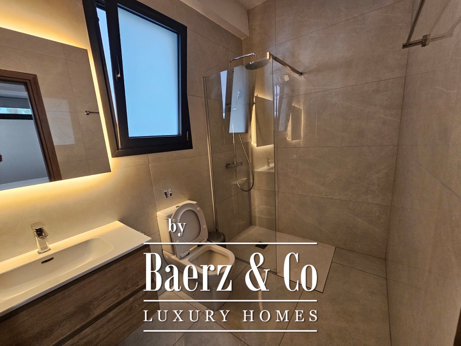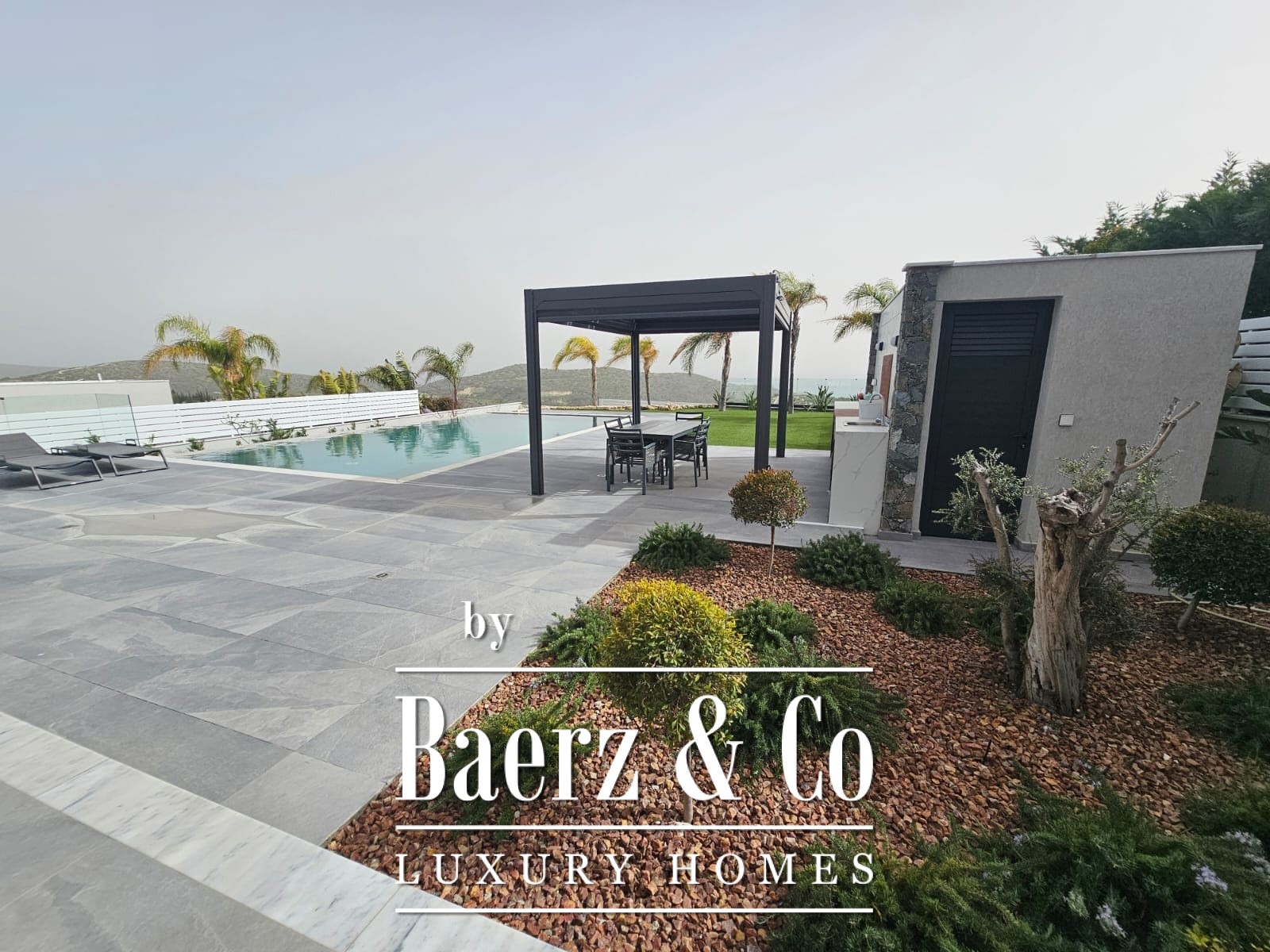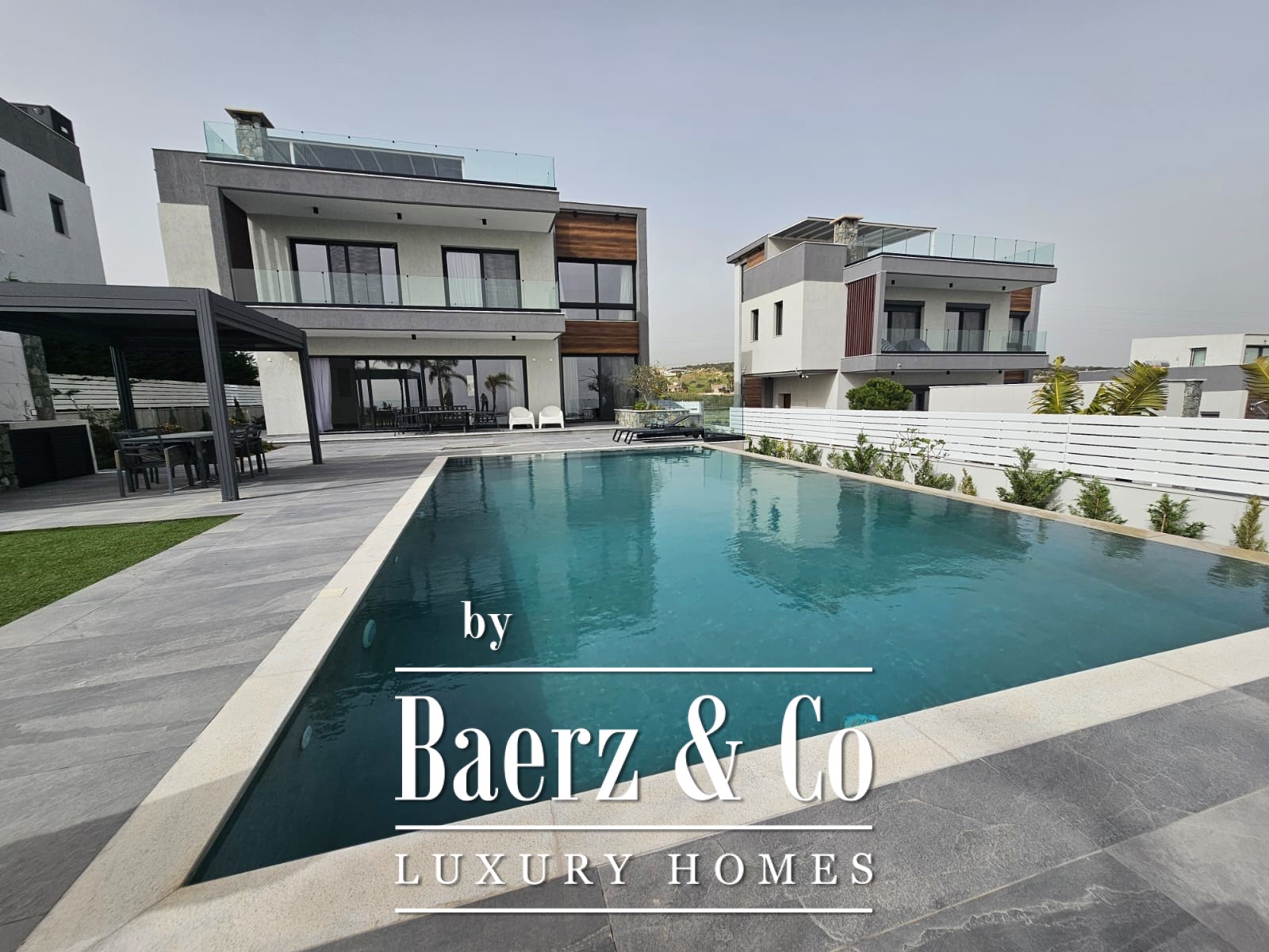 Gebouwd op een fraai aangelegd perceel van 888 m² biedt de villa bewoners de mogelijkheid om in alle rust te genieten langs het privézwembad, samen te komen in de zonnige BBQ-ruimte of te ontspannen in de bijzondere leefruimten. De indeling omvat vier slaapkamers, drie badkamers en twee aparte gastentoiletten, met een extra servicekamer voor extra gemak. De interieurs zijn afgewerkt tot in detail, met grootformaat tegels, aluminium ramen met dubbel glas voor thermische en akoestische isolatie, en een volledig geïntegreerde vloerverwarming en airconditioning.