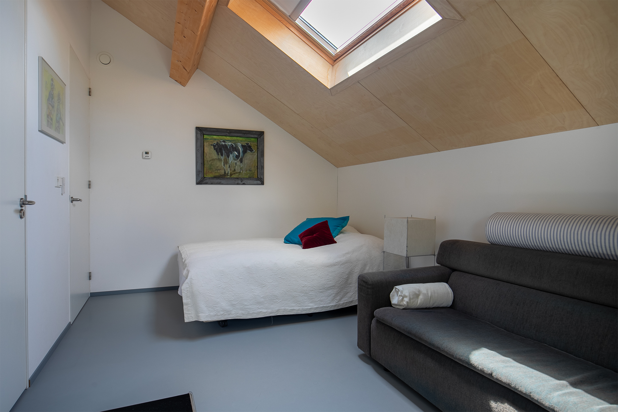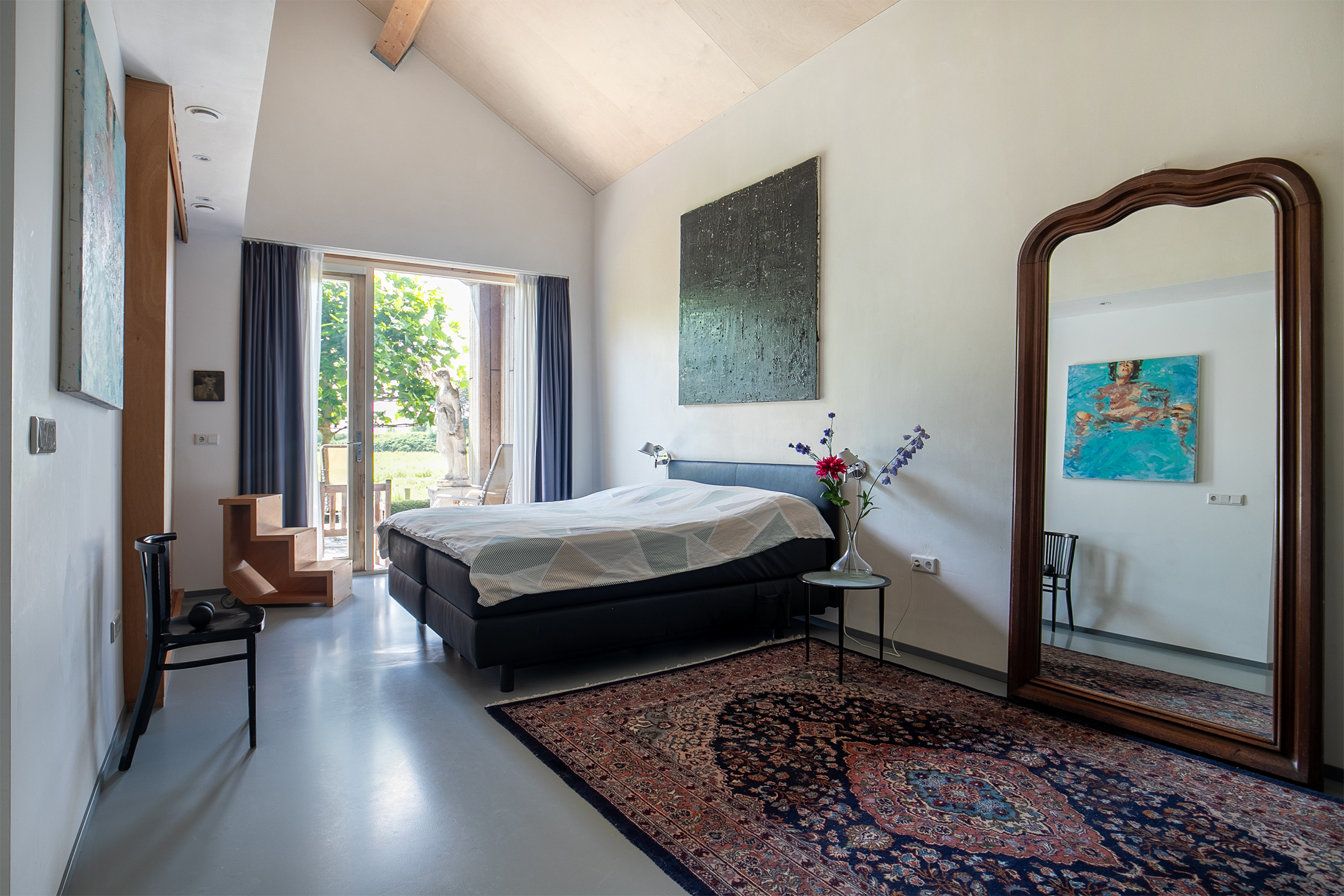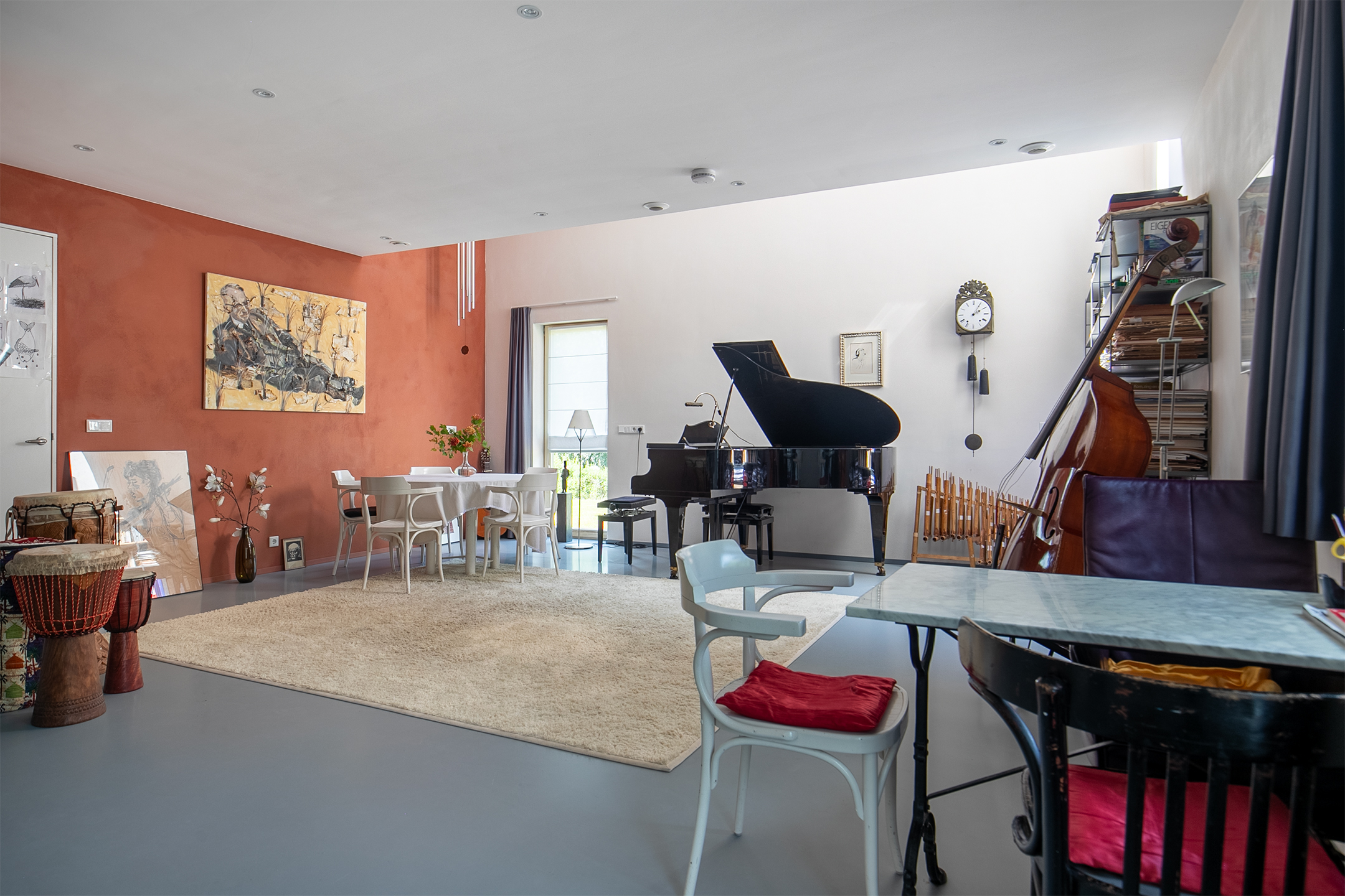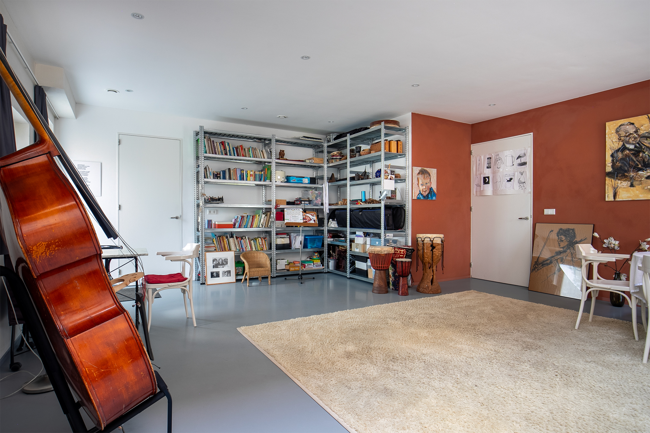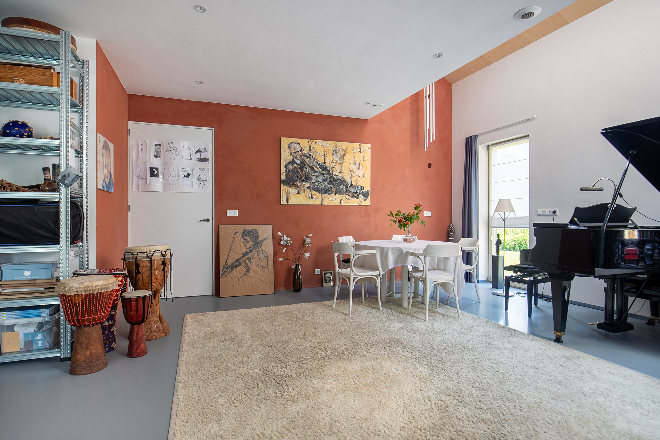 Daarnaast vindt u op de begane grond een bijkeuken, een apart toilet en een royale slaapkamer met ensuite badkamer – perfect voor gelijkvloers wonen of als gastenverblijf. Uniek is de extra zeer ruime kamer, die naar eigen wens in te richten is als salon, werkruimte of extra slaapkamer. Dankzij de aparte toegang biedt deze ruimte uitstekende mogelijkheden voor een beroep aan huis zonder in te leveren op privacy.