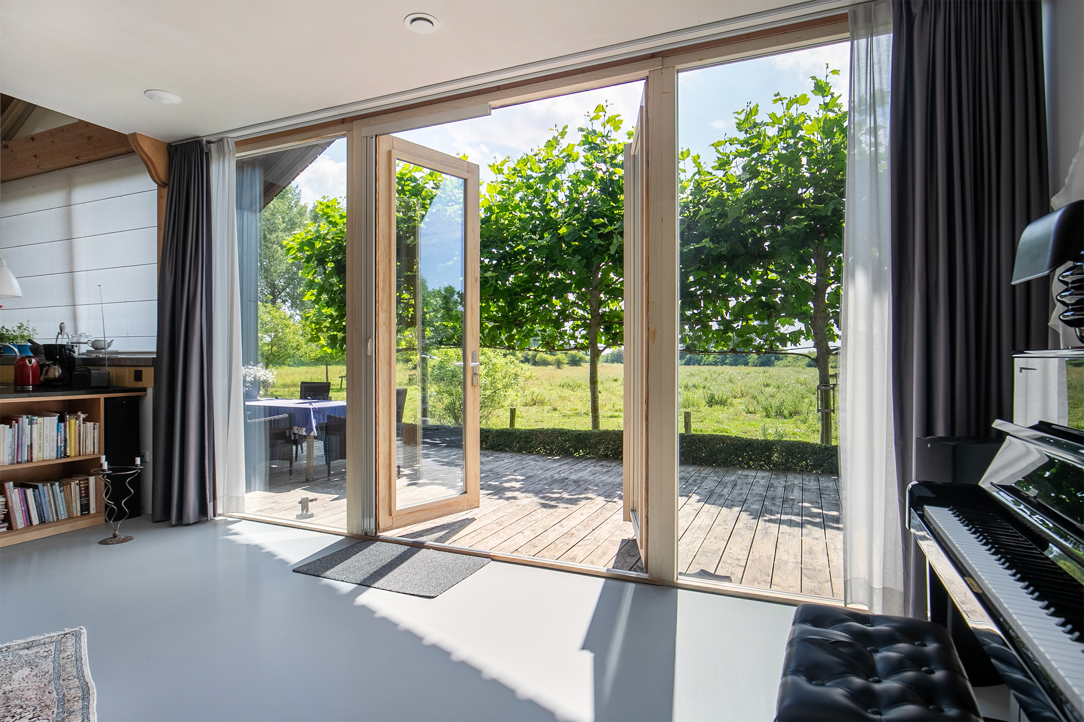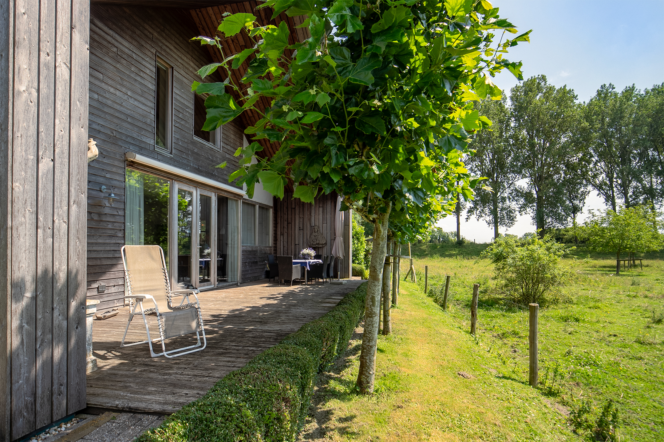 De fraai aangelegde tuin rondom de woning biedt rust en privacy, met als blikvanger de zuidelijk georiënteerde patio die uitkijkt over de polder. Dankzij de natuurbestemming van het omliggende gebied blijft dit prachtige, ongerepte uitzicht voor altijd behouden.
