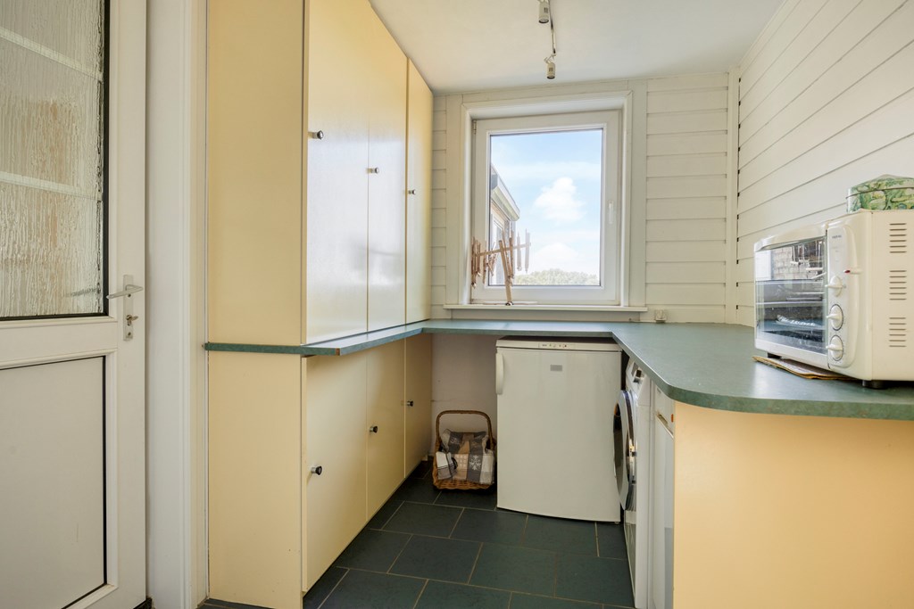 De open keuken grenst direct aan de woonkamer en beschikt over een L-vormig aanrechtblad met een kookplaat, afzuigkap, vaatwasser en spoelbak. Ook zijn er een ovencombinatie, een koelkast en voldoende opbergruimte aanwezig. Hoewel de keuken functioneel en ruim is, kan deze naar wens gemoderniseerd worden om aan te sluiten bij persoonlijke smaak.