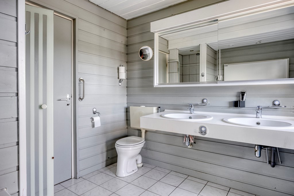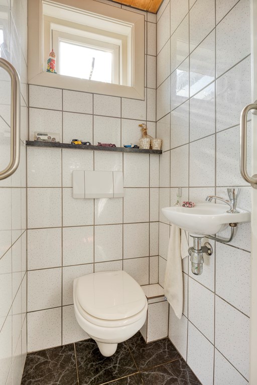 Uniek op de begane grond is de aanwezigheid van een badkamer, wat gelijkvloers wonen mogelijk maakt. Deze ruimte is geheel betegeld en voorzien van een douche met glazen wand, toilet, wastafel en opbergmeubel, wat zorgt voor extra comfort en gebruiksgemak.