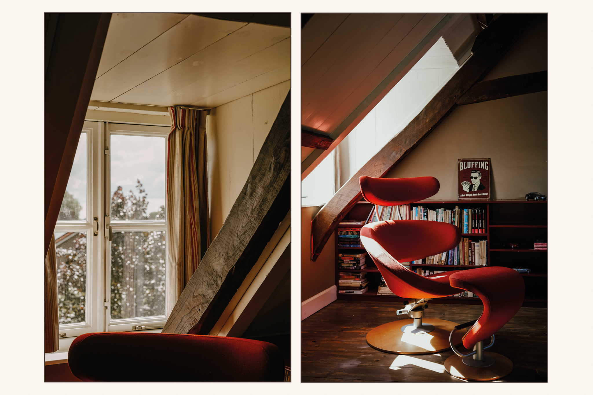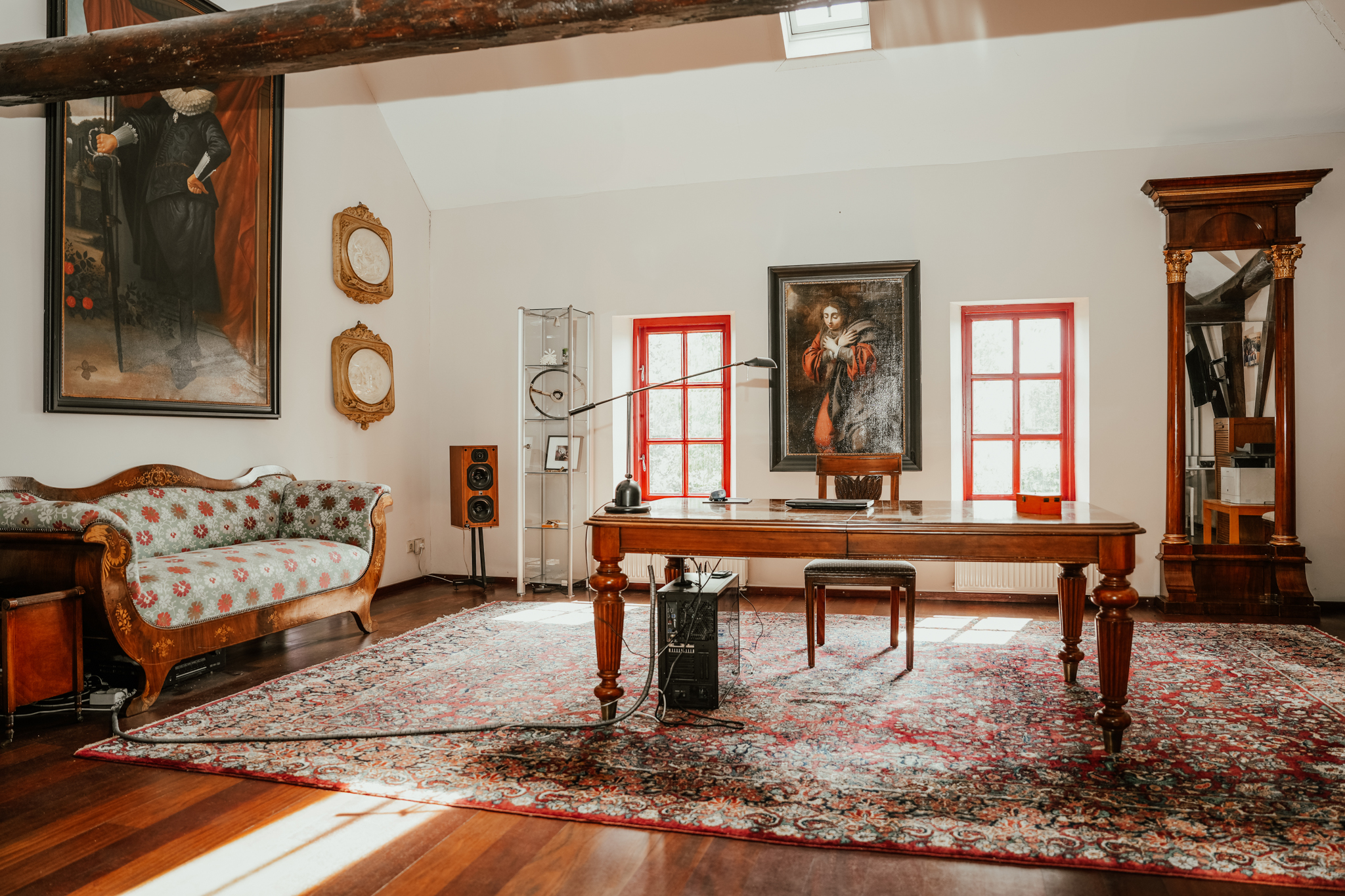 Een riant kantoor met archiefruimte, drie slaapkamers, waarvan twee met haard, een werkruimte, twee badkamers en een waskamer met infraroodsauna op de eerste verdieping.