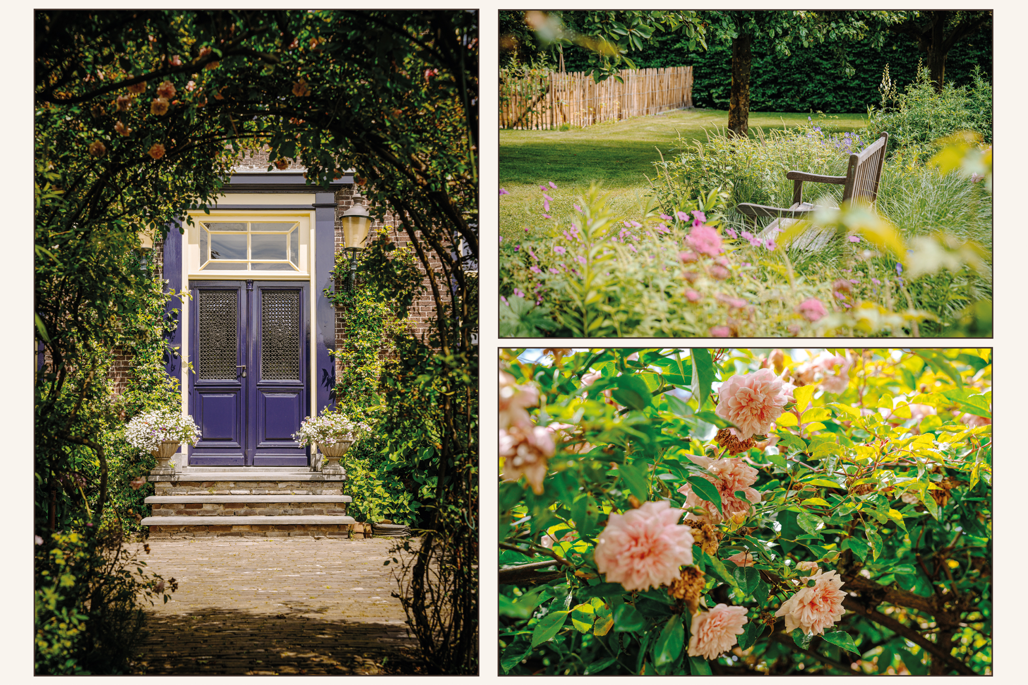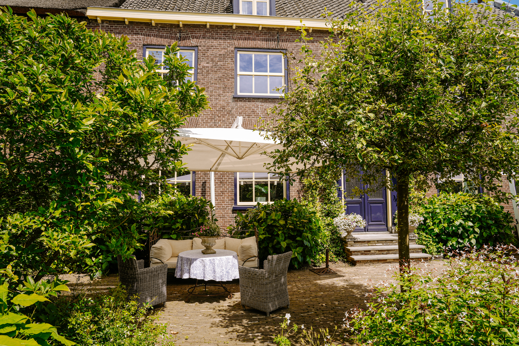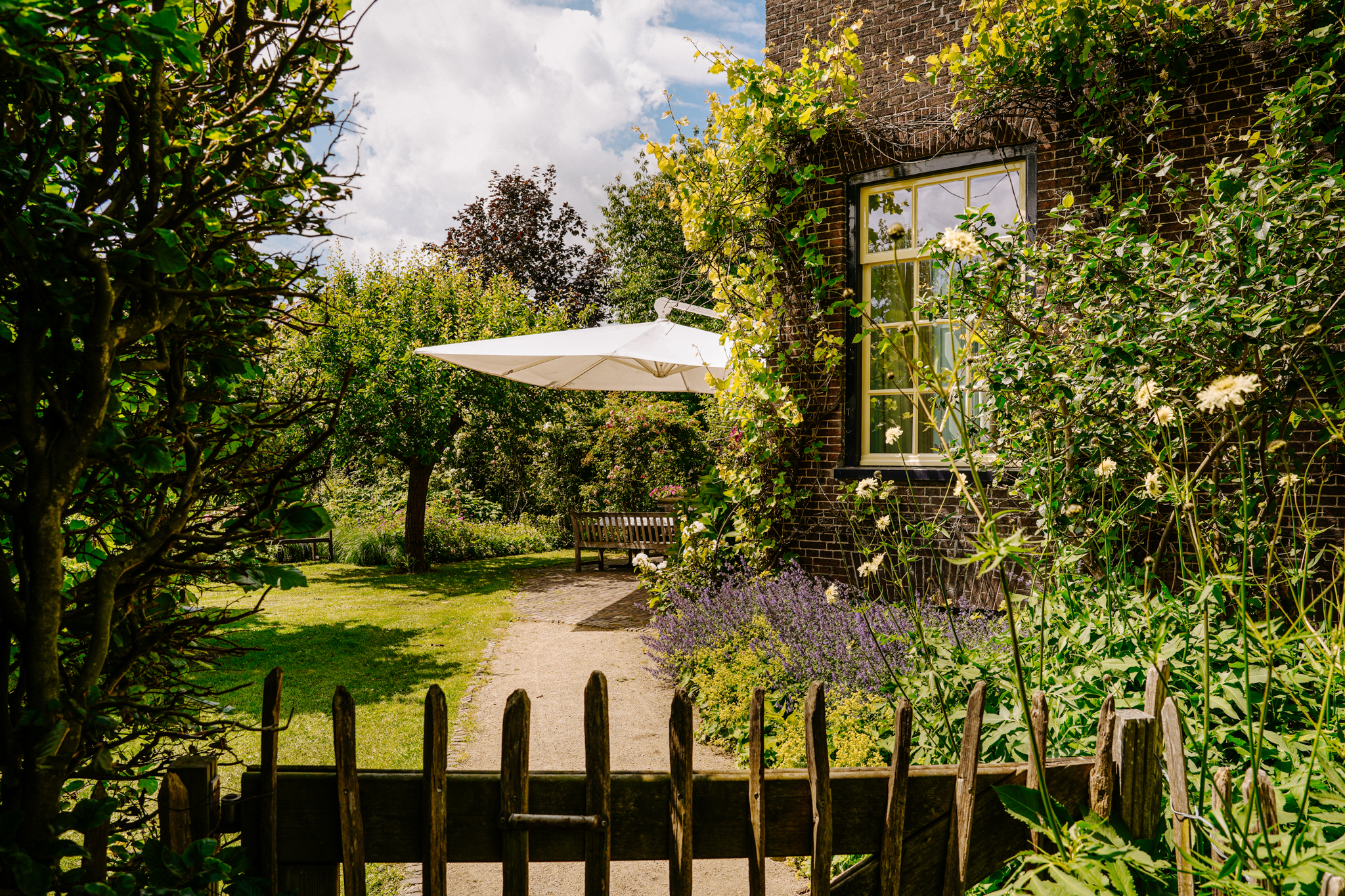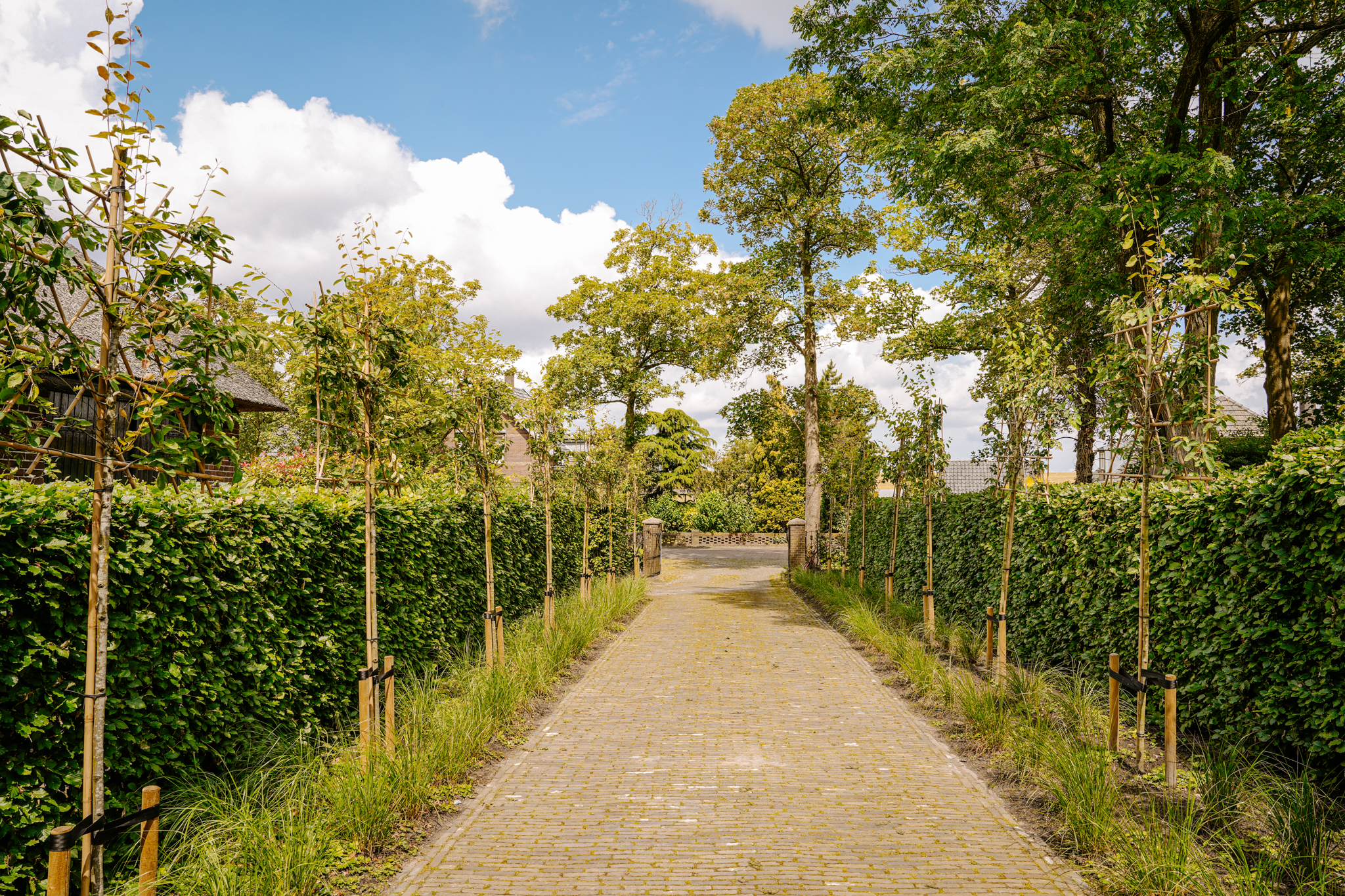 De imposante oprit van gebakken klinkers, geflankeerd door borders met siergrassen, geleide krentenbomen en hoge beukenhagen, leidt naar de dubbele monumentale voordeur.