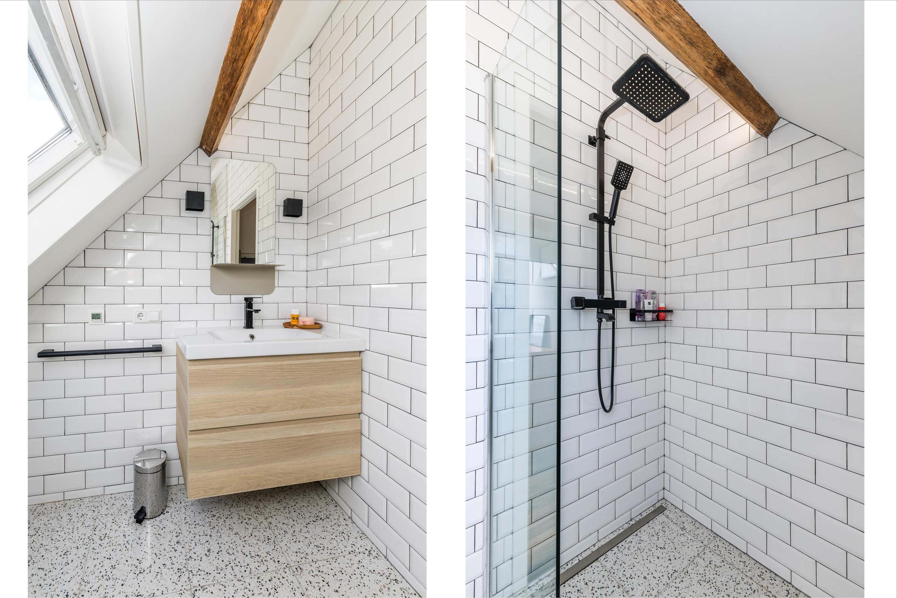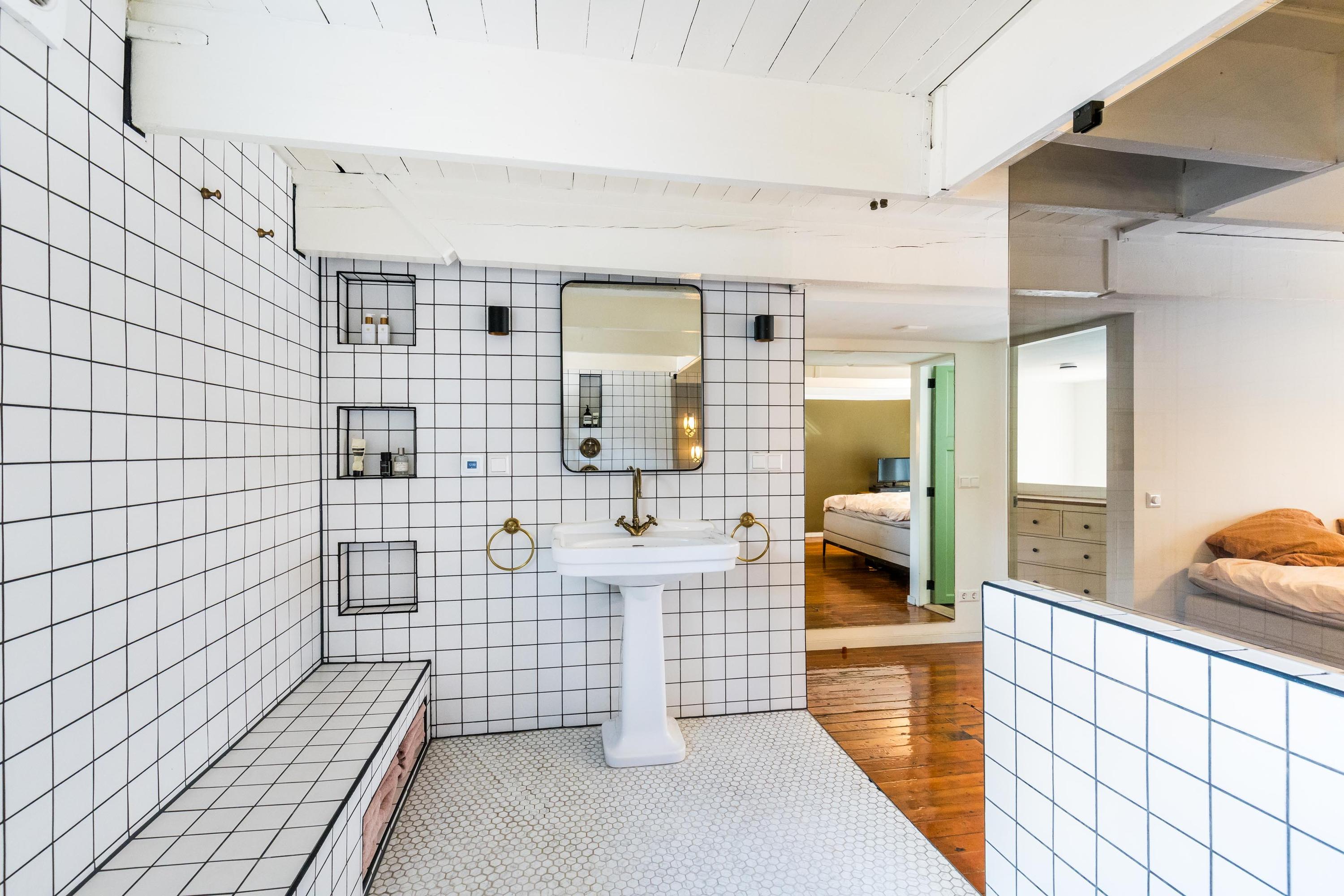 Op de eerste verdieping bevindt zich een royale slaapkamer met grote kasten, een apart toilet en een comfortabele badkamer met ligbad en dubbele douche.