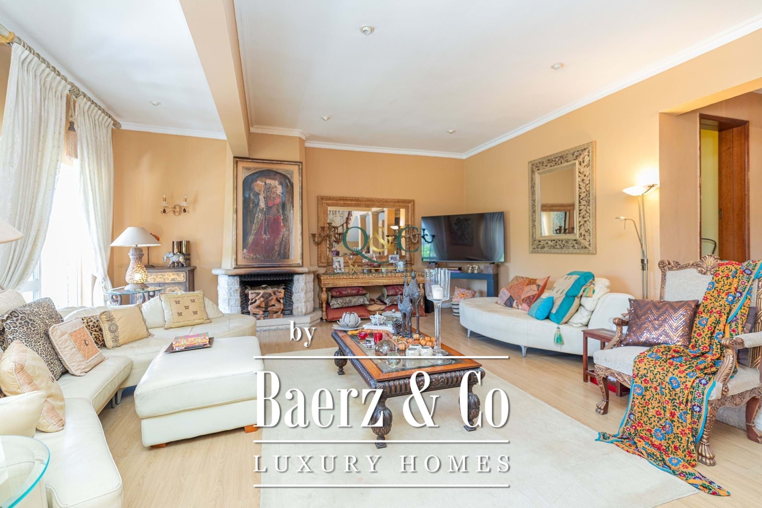 Set behind electric gates, the fully enclosed gardens provide a variety of inviting spaces for both relaxation and entertaining. From the driveway with ample parking, steps lead up to a covered main terrace and double doors opening into a grand entrance hall. This flows into a bright sitting room with fireplace and sliding doors back onto the terrace, as well as a semi-open dining room. A sweeping staircase adds a touch of grandeur, leading to the upper floor.
