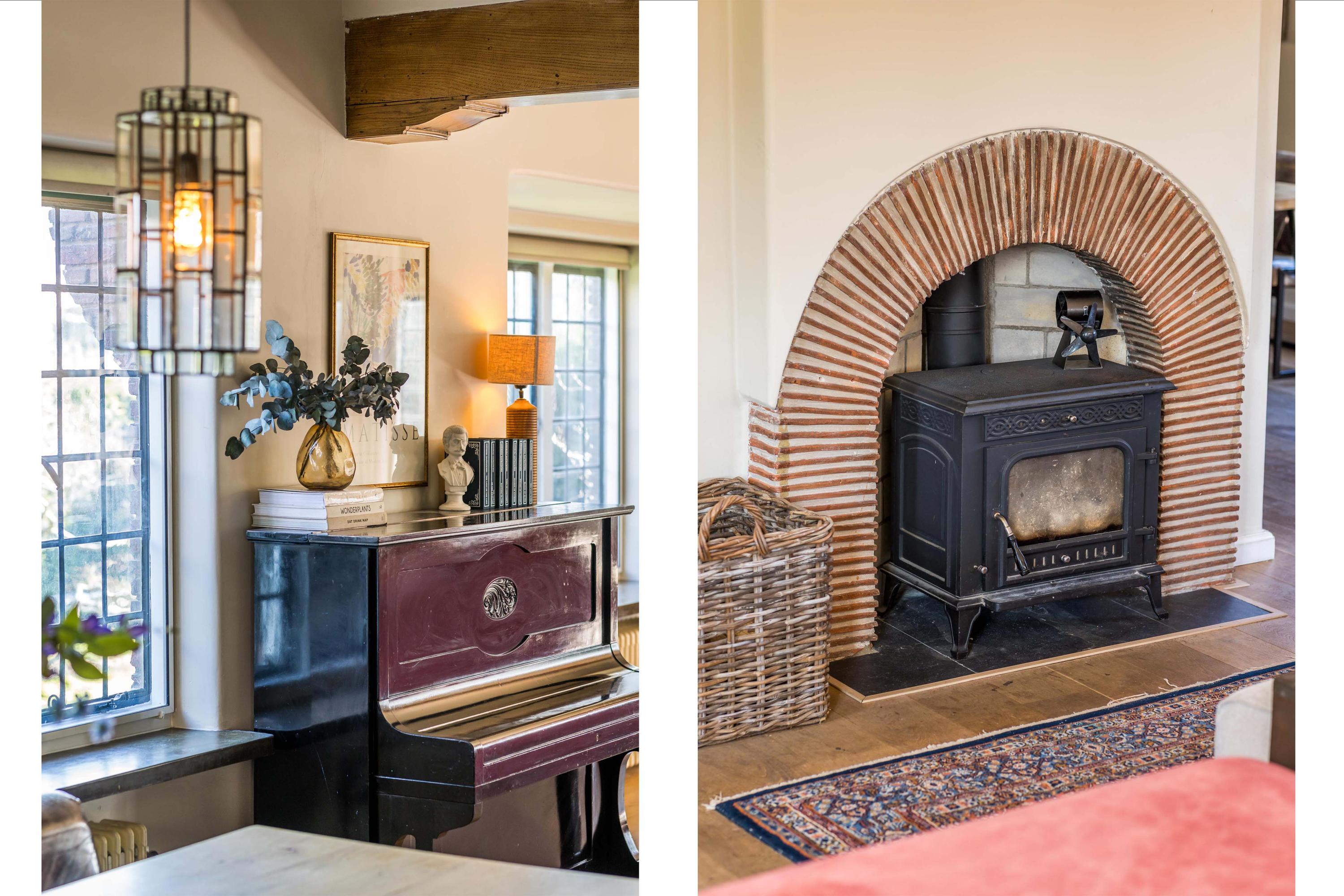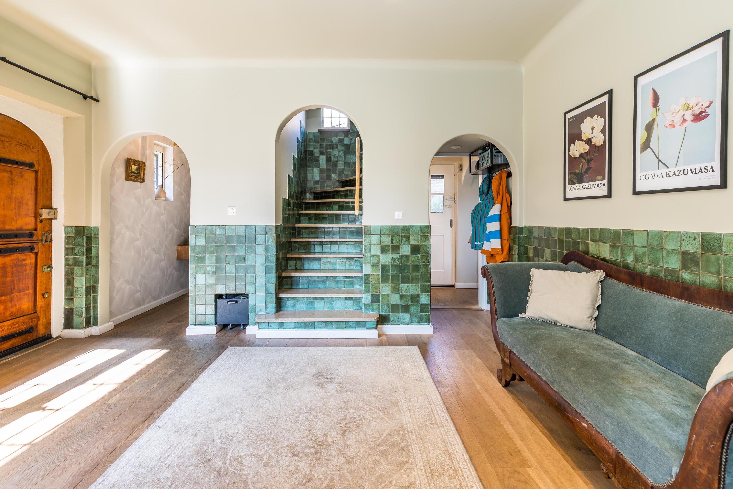 Begane grond: Entree middels een halfronde voordeur, bijzonder ruime hal waar je bij wijze van spreken zou kunnen rolschaatsen, maar van geluk zeker eens een dansje zal doen. De charmante woonkamer met houtkachel, karakteristieke erker en daglicht van 3 zijden met prachtige glas-in-lood-raampartijen, de open woonkeuken geeft een moderne twist. Het leuke aan de plattegrond op de begane grond is dat je een rondje kan lopen, via een deur in de keuken kom je via een kleine gang weer in de balzaal van een hal. Aan de hal grenst ook de toiletruimte en een vaste kast. De hal en trapopgang zijn voorzien van authentieke wandtegeltjes in verbluffend goede staat.