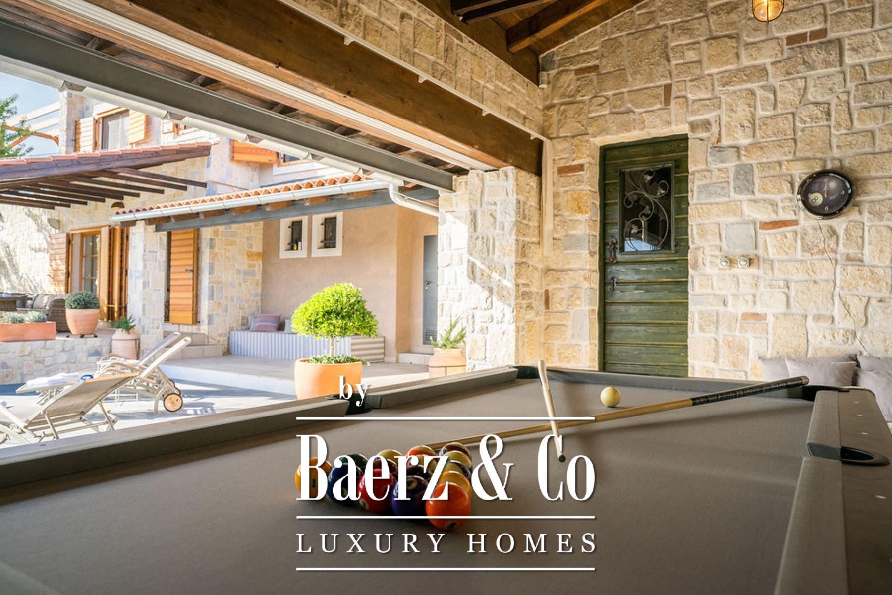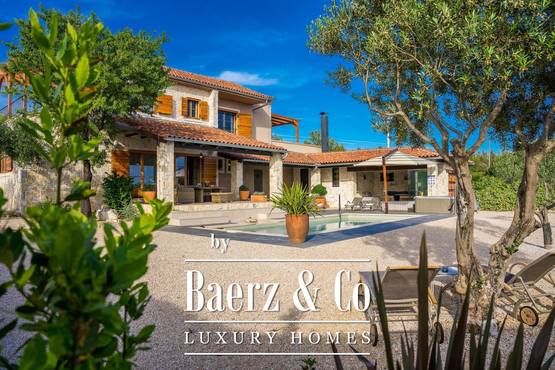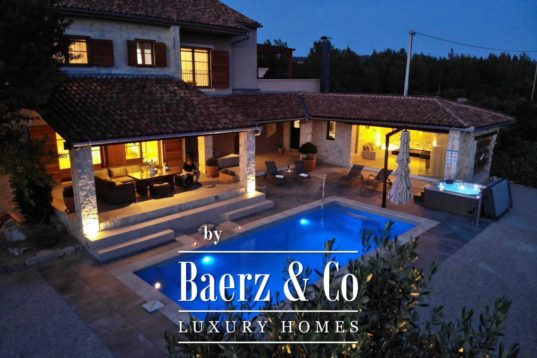 and a sliding glass wall, which allows it to open towards the pool. The complex also includes a sports field with artificial grass, designed for small football, volleyball or badminton, a bocce court, a Mediterranean garden with about 30 olive trees, fruit trees and herbs, and covered parking for 3 cars.The villa is built to top standards and is equally well equipped. Each room has air conditioning, and the bathrooms have underfloor heating. It is also equipped with top-of-the-line kitchen appliances, video surveillance, an automatic irrigation system, an anti-burglary system, 5G internet and a top-of-the-line sound system. It is located in a prime location, less than 150 meters from the sea.All other information on request.