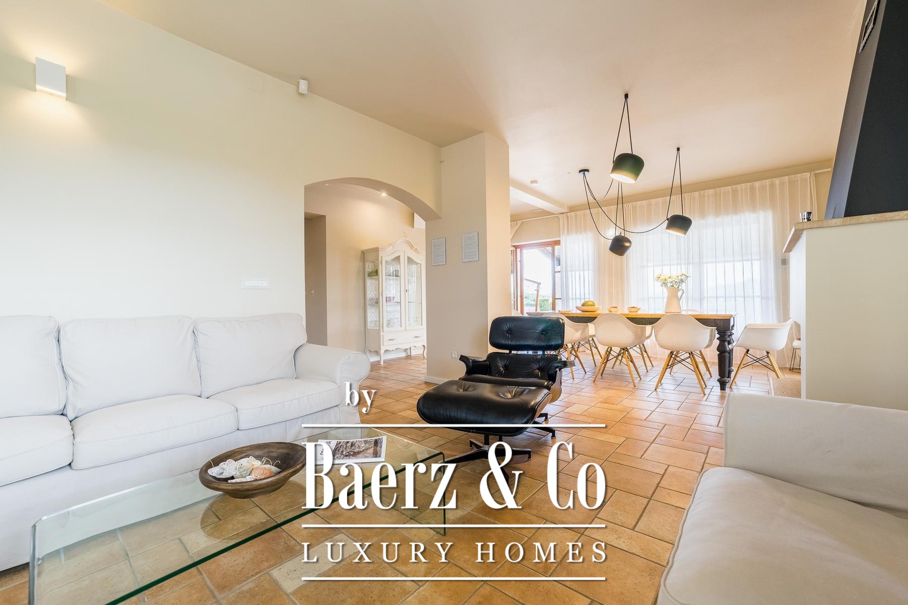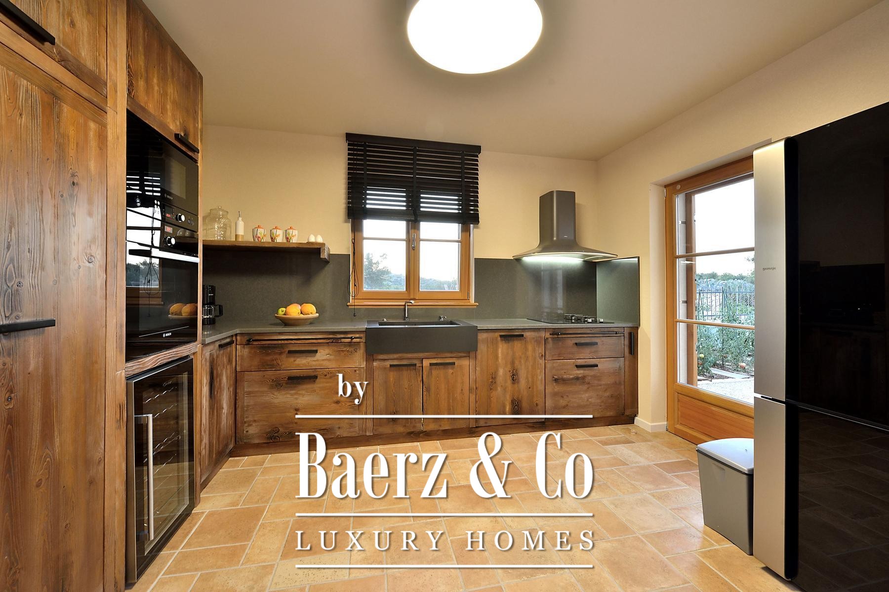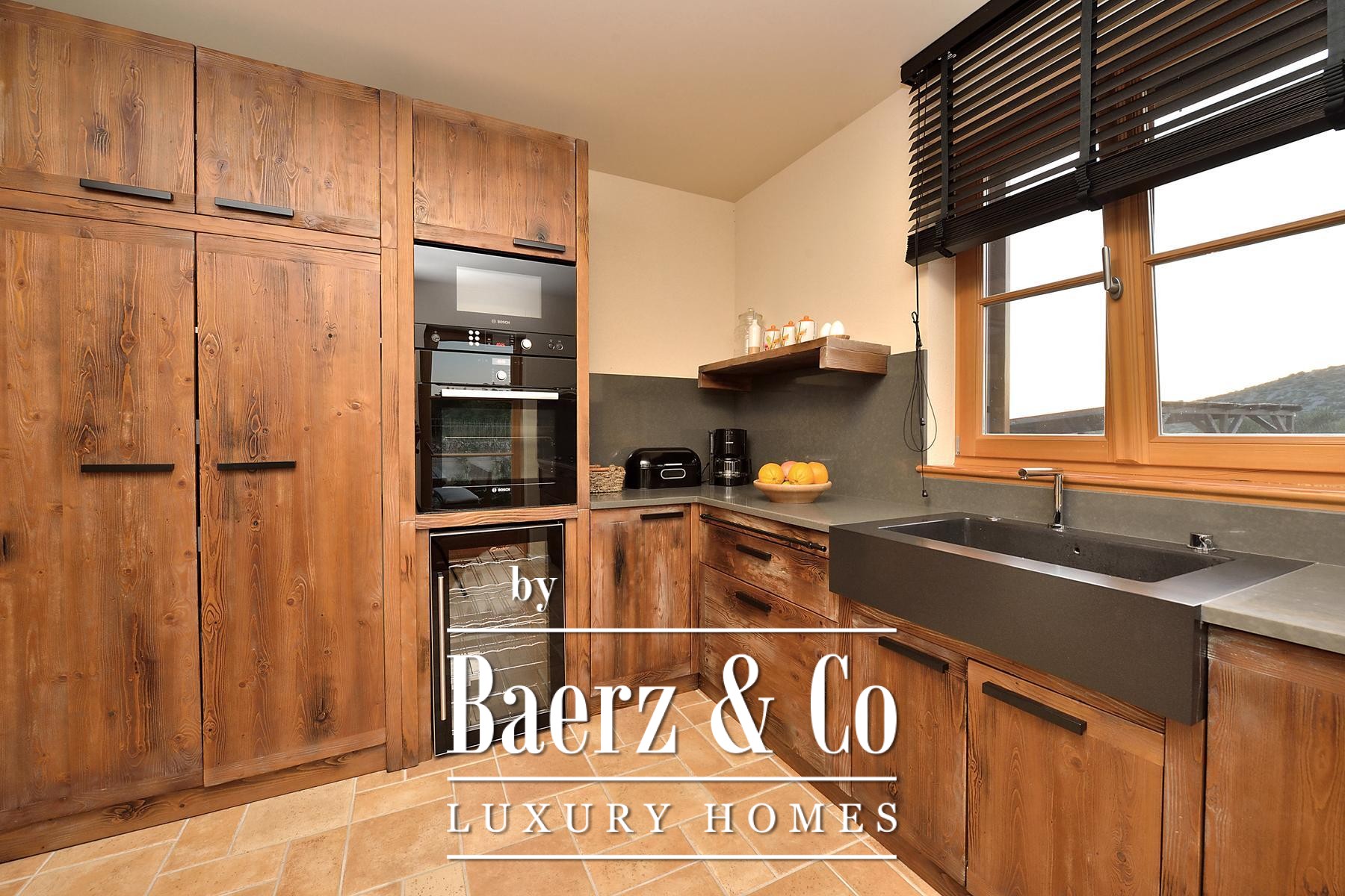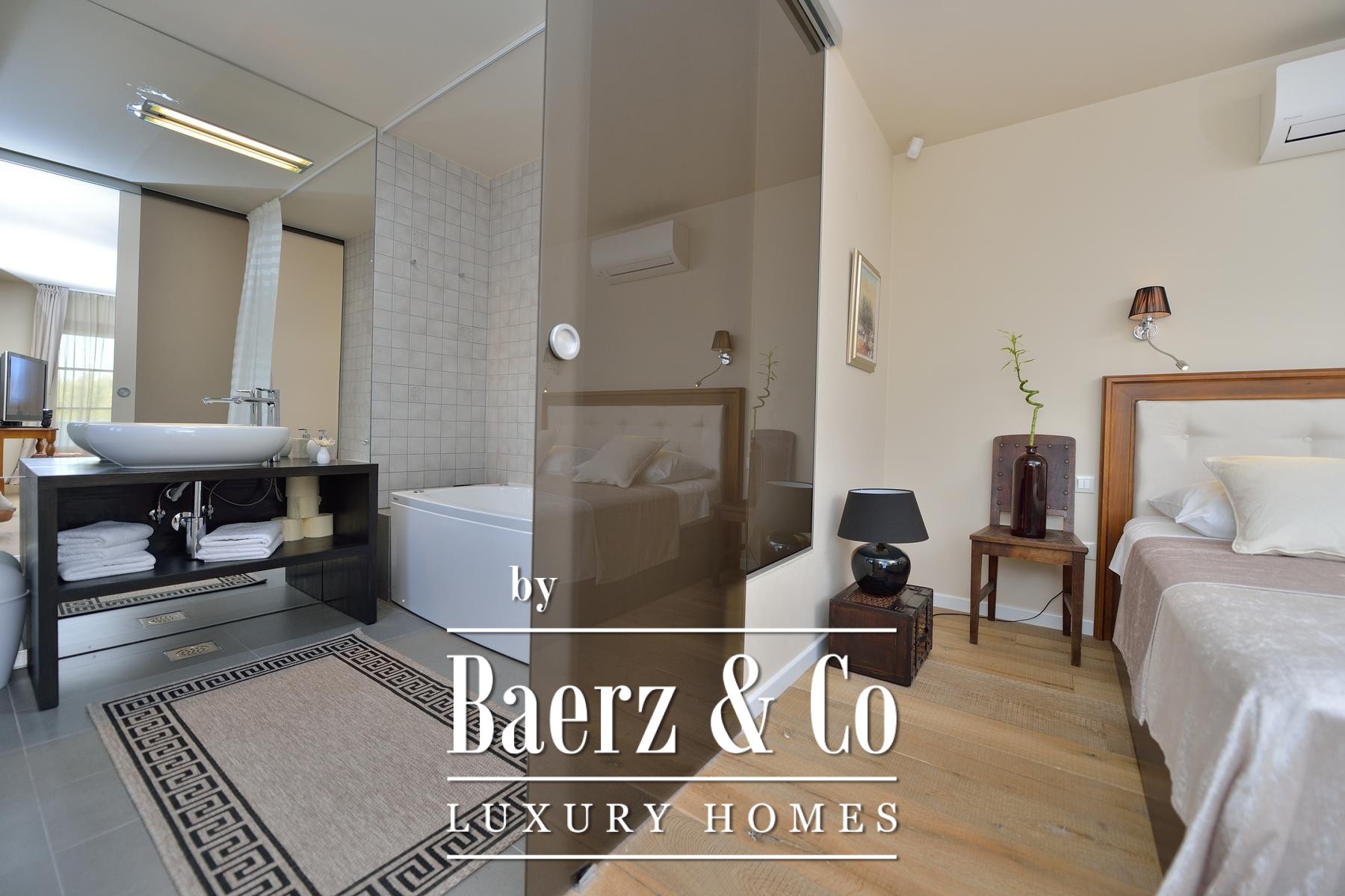 and a sliding glass wall, which allows it to open towards the pool. The complex also includes a sports field with artificial grass, designed for small football, volleyball or badminton, a bocce court, a Mediterranean garden with about 30 olive trees, fruit trees and herbs, and covered parking for 3 cars.The villa is built to top standards and is equally well equipped. Each room has air conditioning, and the bathrooms have underfloor heating. It is also equipped with top-of-the-line kitchen appliances, video surveillance, an automatic irrigation system, an anti-burglary system, 5G internet and a top-of-the-line sound system. It is located in a prime location, less than 150 meters from the sea.All other information on request.