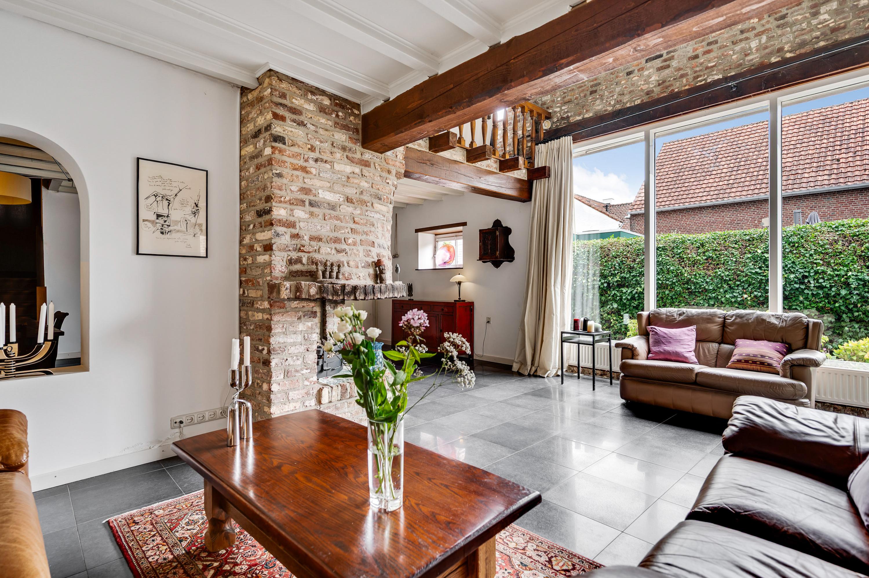 De ruime en lichte woonkamer (± 56 m²) biedt optimaal tuincontact dankzij de grote raampartijen aan de zijkant en dubbele openslaande deuren aan de achterzijde. De woonkamer is verdeeld in een gezellige zithoek met open haard en een apart eetgedeelte, ideaal voor diners met familie en vrienden. De moderne vloertegels en strakke stucwanden geven de ruimte een tijdloze uitstraling.