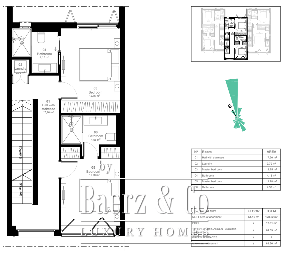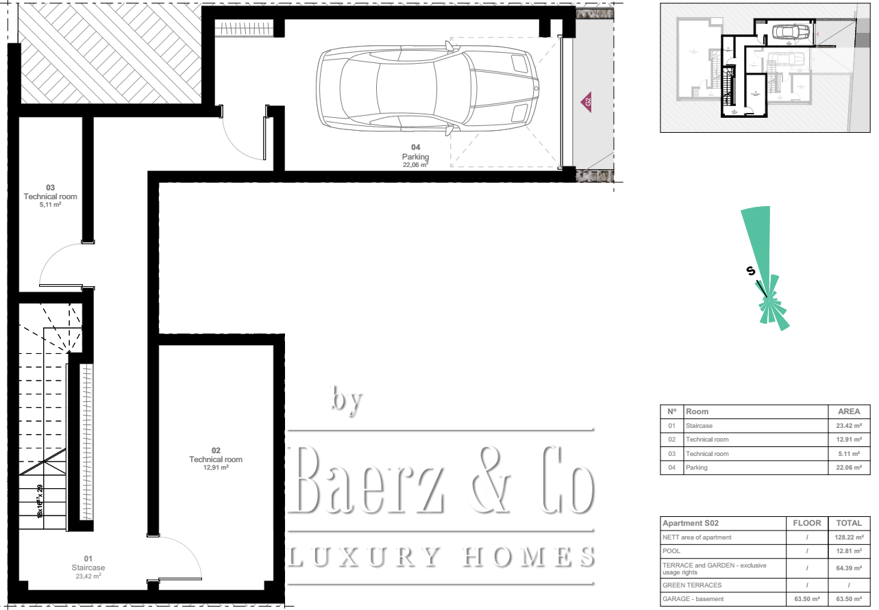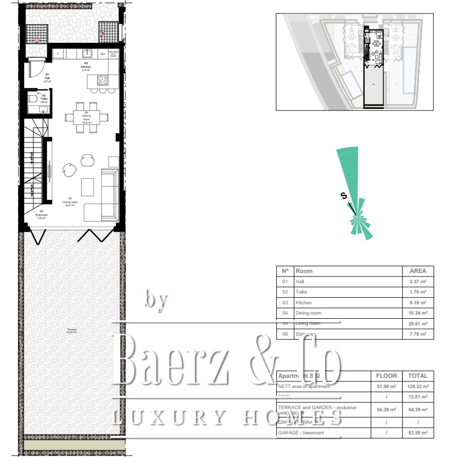 The townhouse has 4 levels. It has a pool that is on the top of the house. The house has a garage spot. It is connected by an asphalt road to the main road.