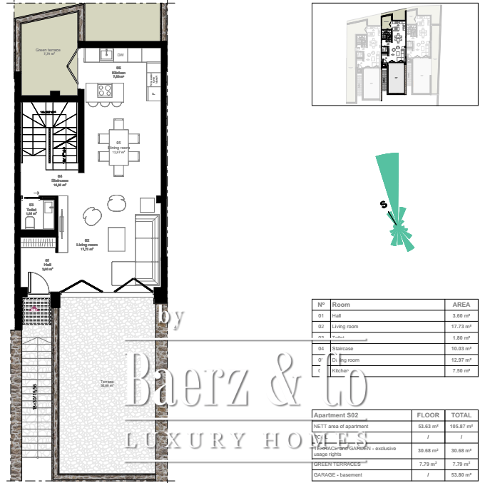 The townhouse has 3 levels. The house has a garage spot. It is connected by an asphalt road to the main road.