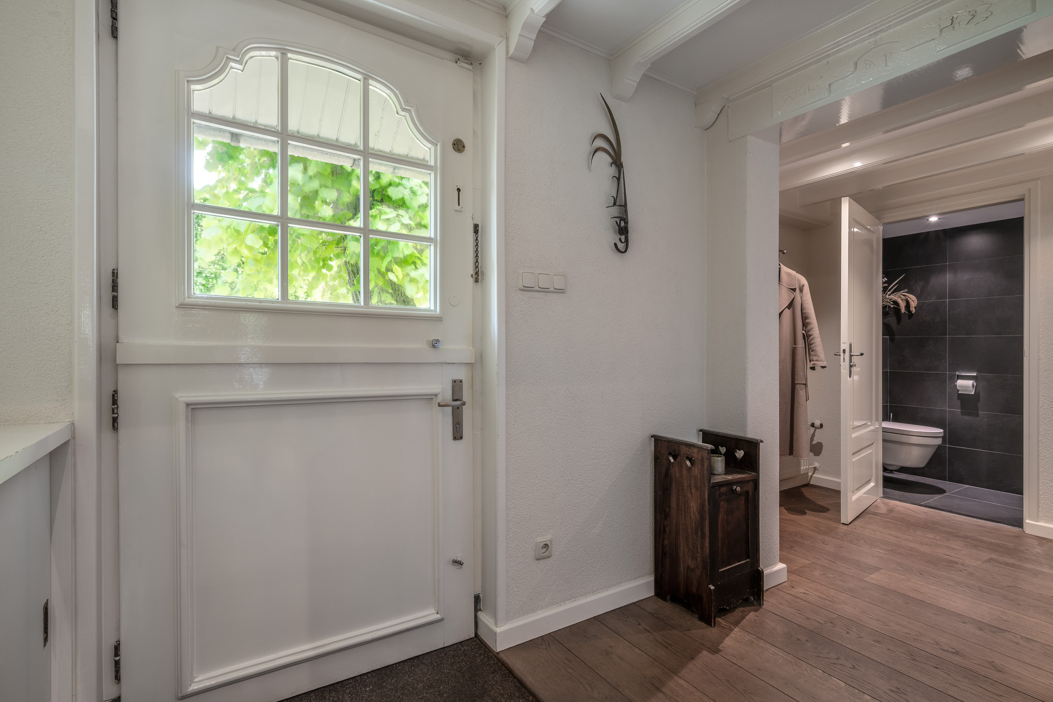 Hal/ entree: een voorportaal biedt ruimte voor de garderobe, de meterkast en een toiletruimte. Eenmaal binnen in de hal ervaar je direct de ruimte die dit object te bieden heeft. De hoge vide met de robuuste trap naar de eerste verdieping vallen op. Vanuit de hal is er toegang tot de woonkamer en de keuken.