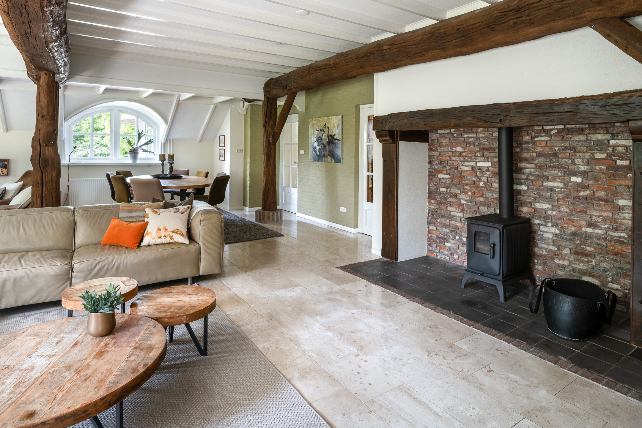 Woonkamer: Een prettige ruime living waar de traditionele balken en de nette afwerking opvallen. De houtkachel staat centraal in de woonkamer. Via de woonkamer, aan de achterzijde van de woning, is een doorgang naar de serre. De serre geeft zicht op de tuin en is voorzien van vloerverwarming.