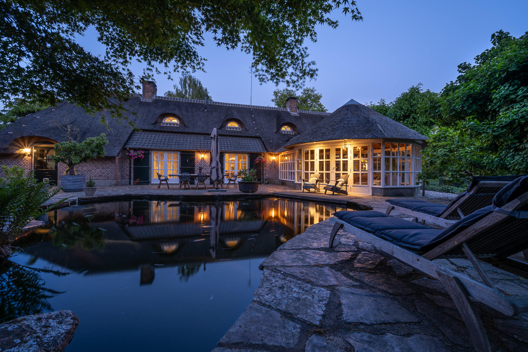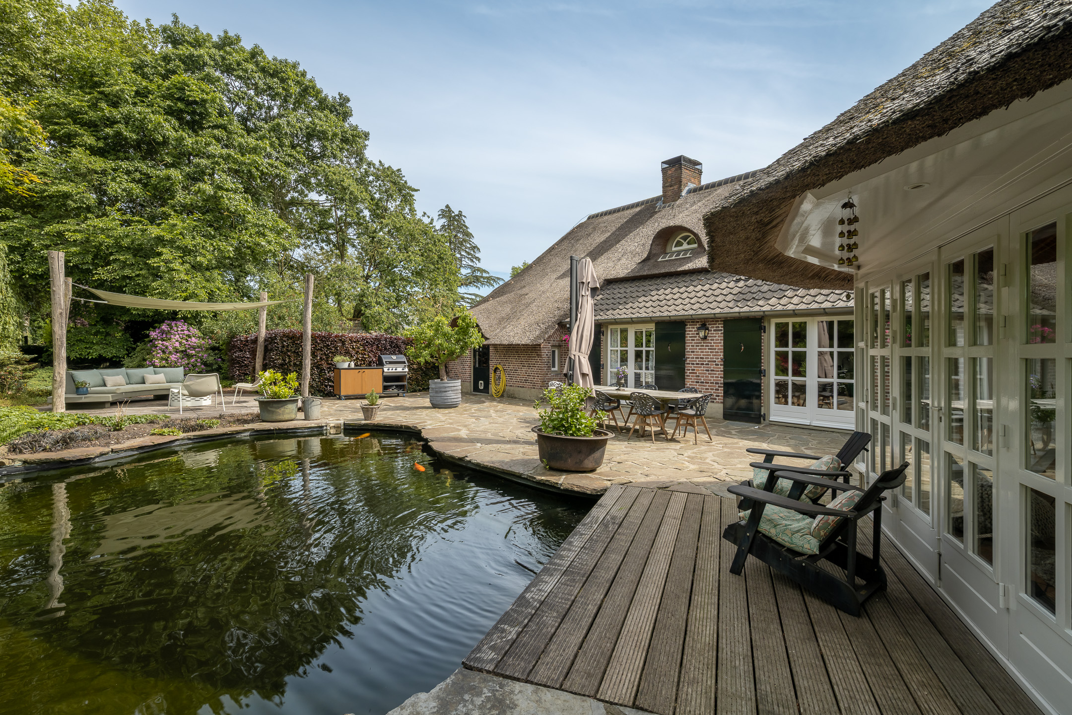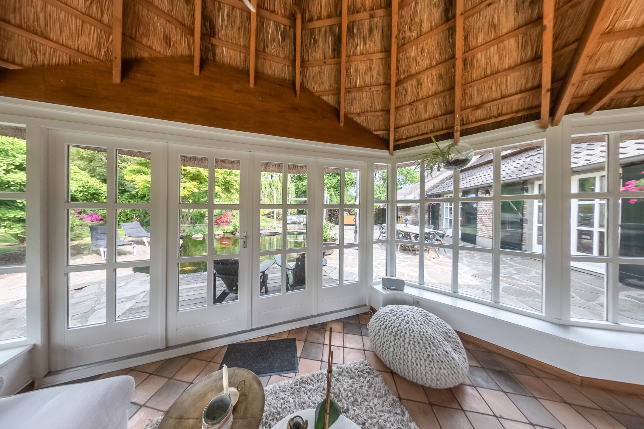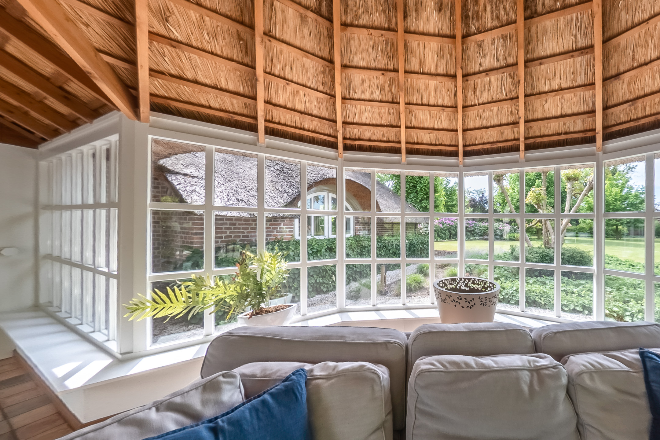 Het authentieke rieten dak geeft de woning een warme en traditionele uitstraling. De verfijnde elementen zoals de witte stalramen, de originele balken en de traditionele indeling typeren dit object.