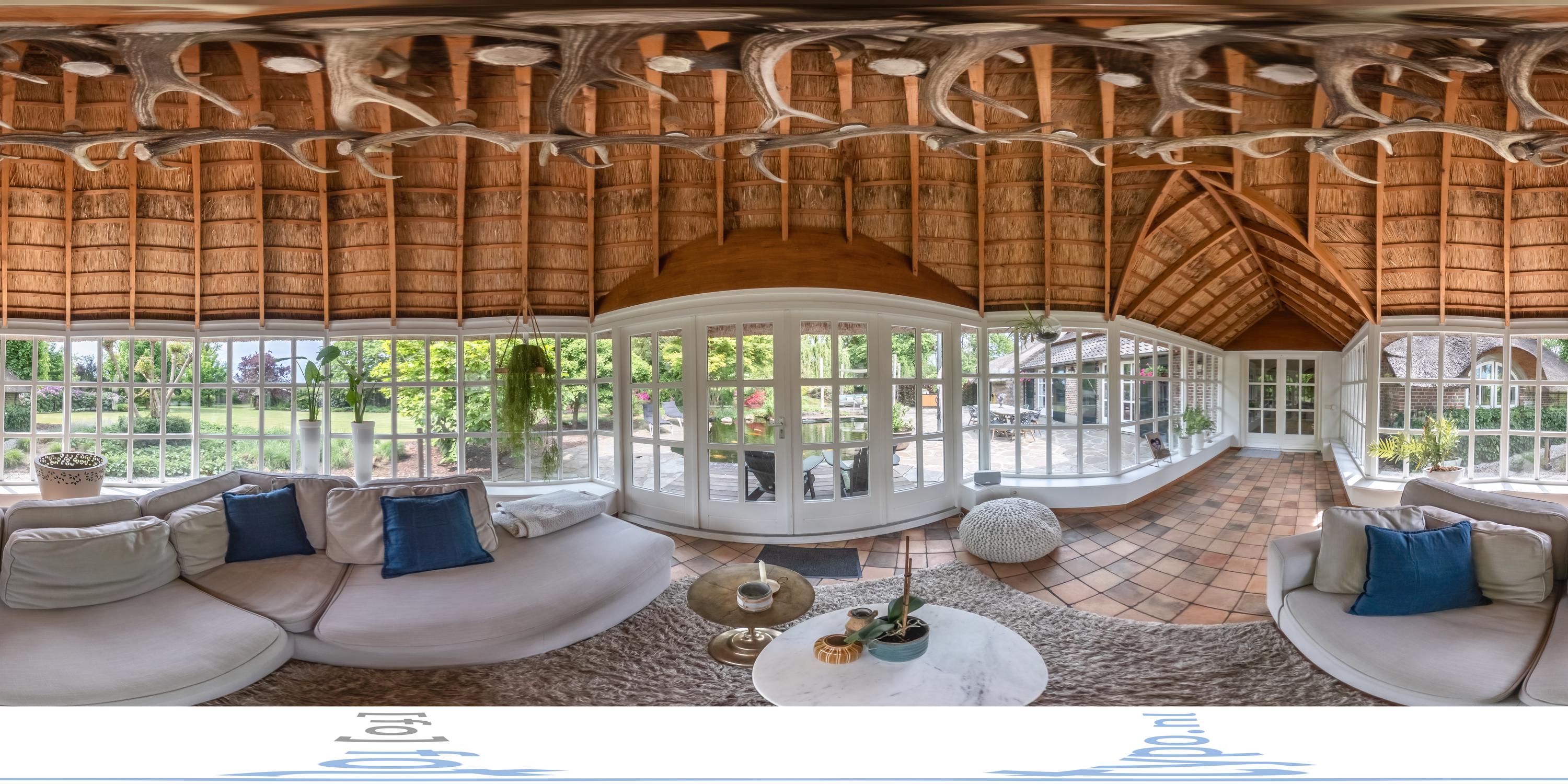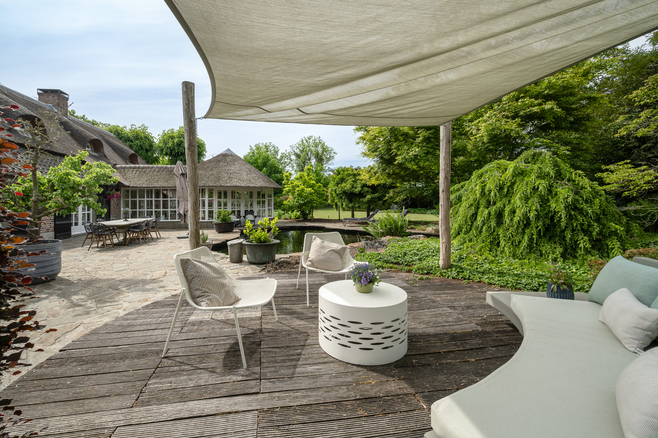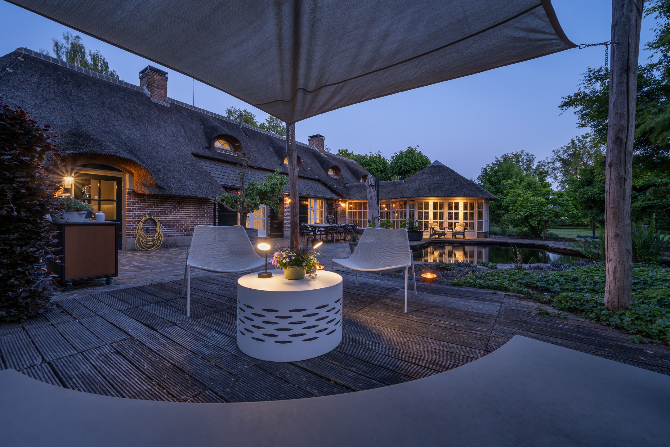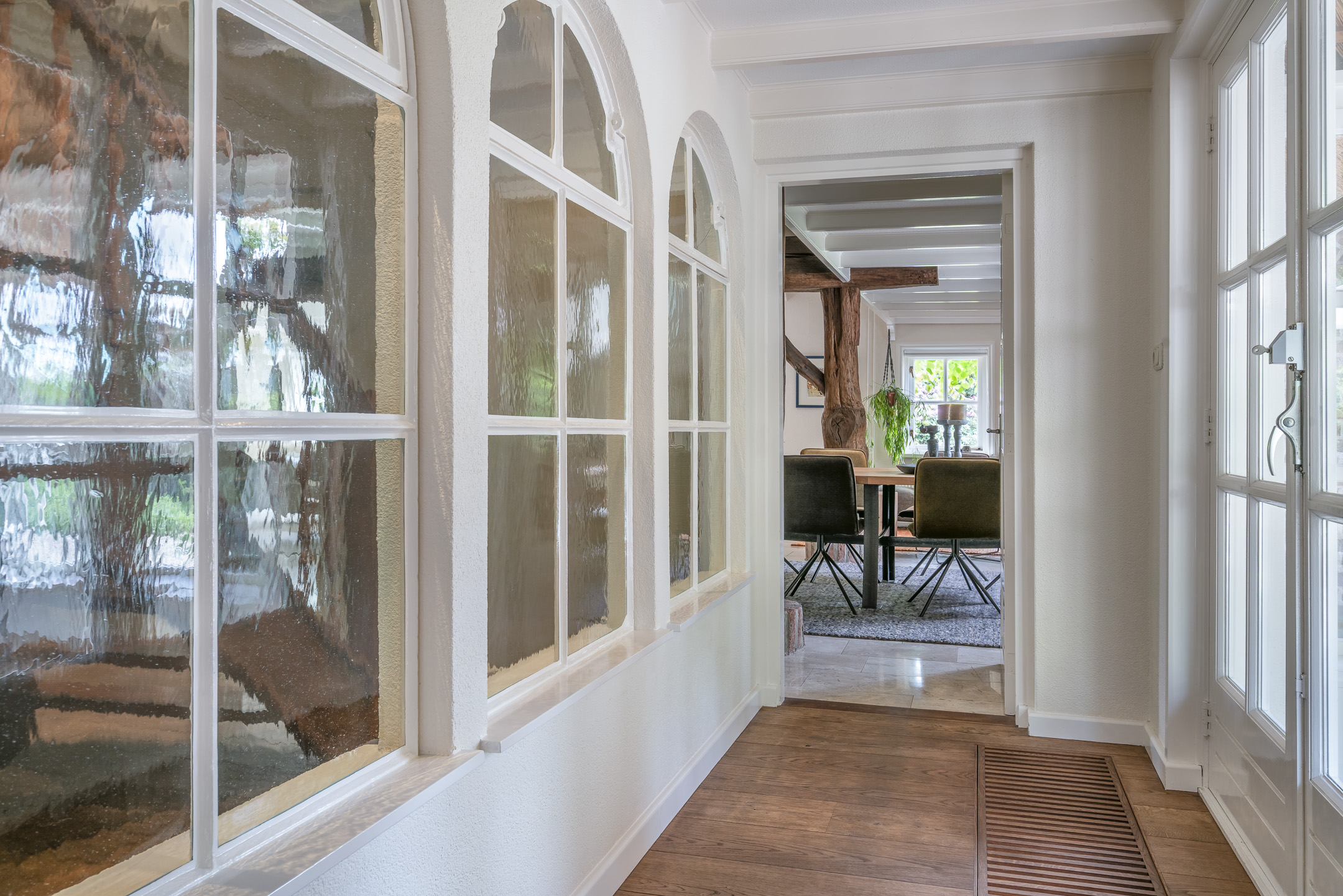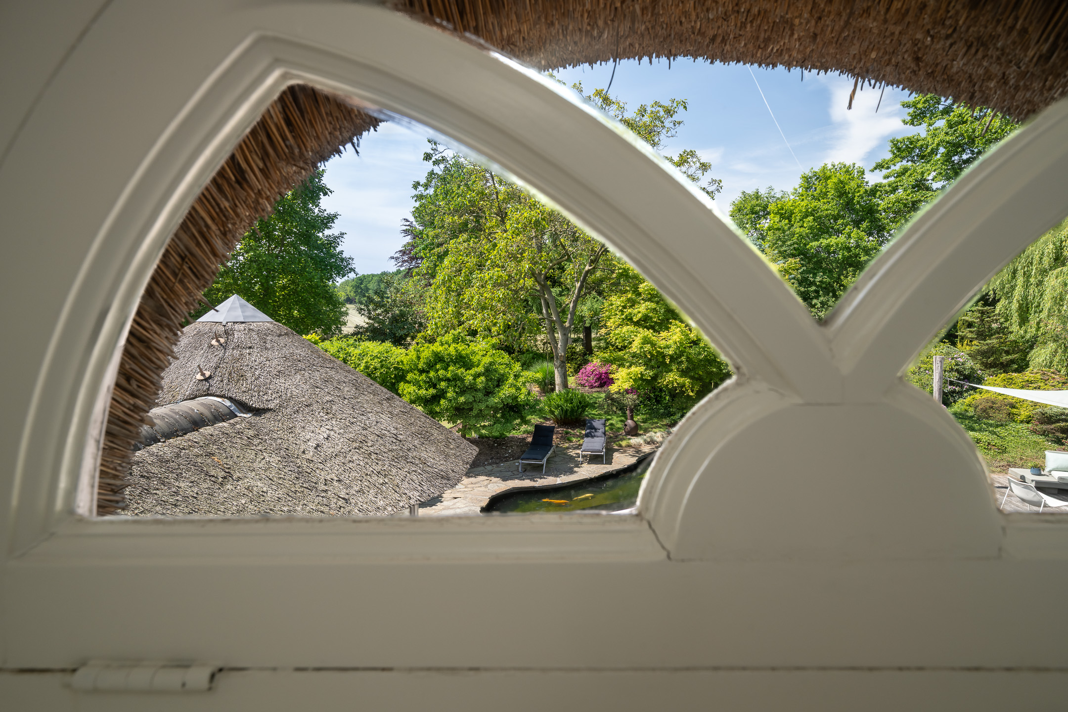 Het authentieke rieten dak geeft de woning een warme en traditionele uitstraling. De verfijnde elementen zoals de witte stalramen, de originele balken en de traditionele indeling typeren dit object.