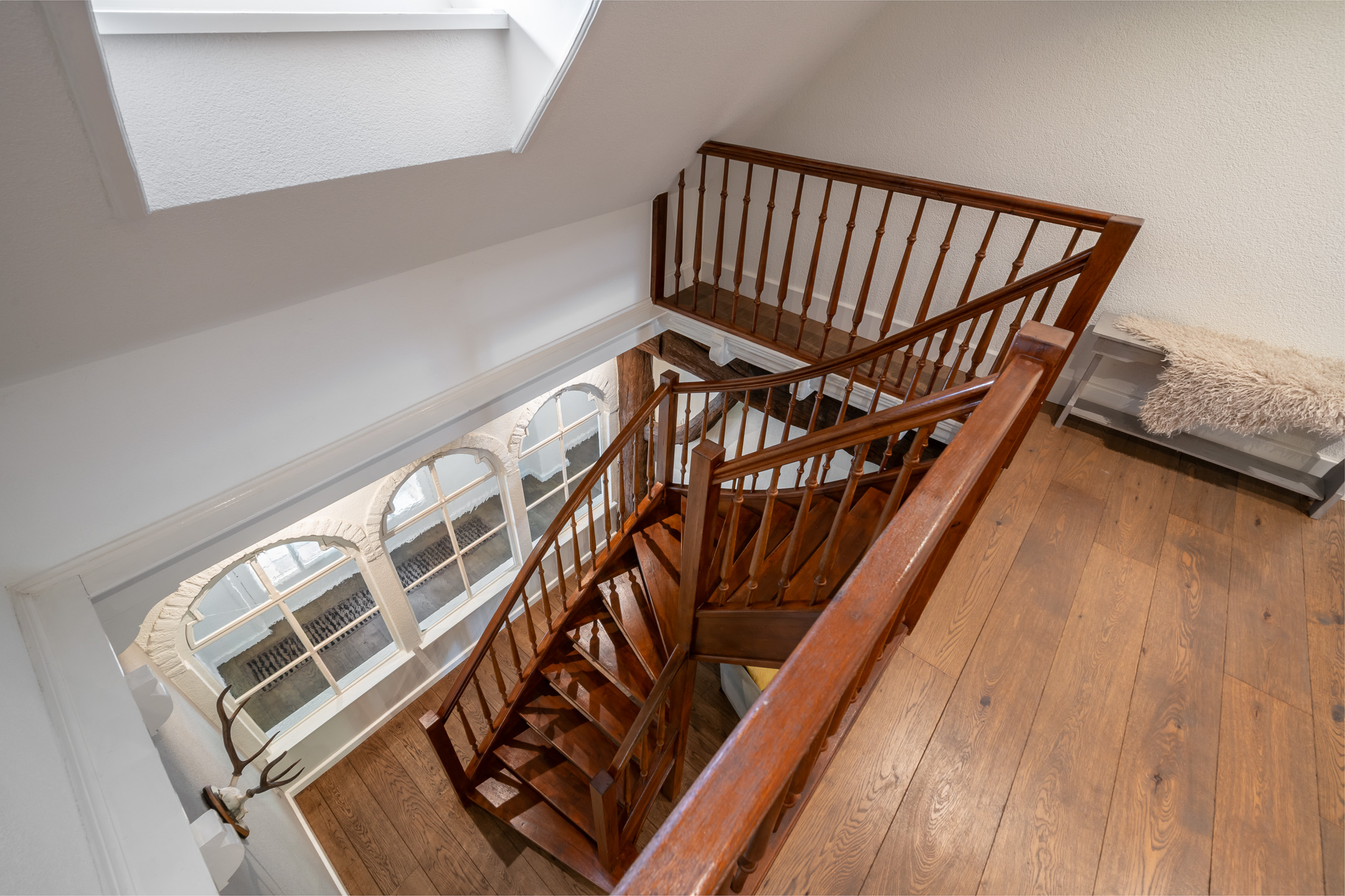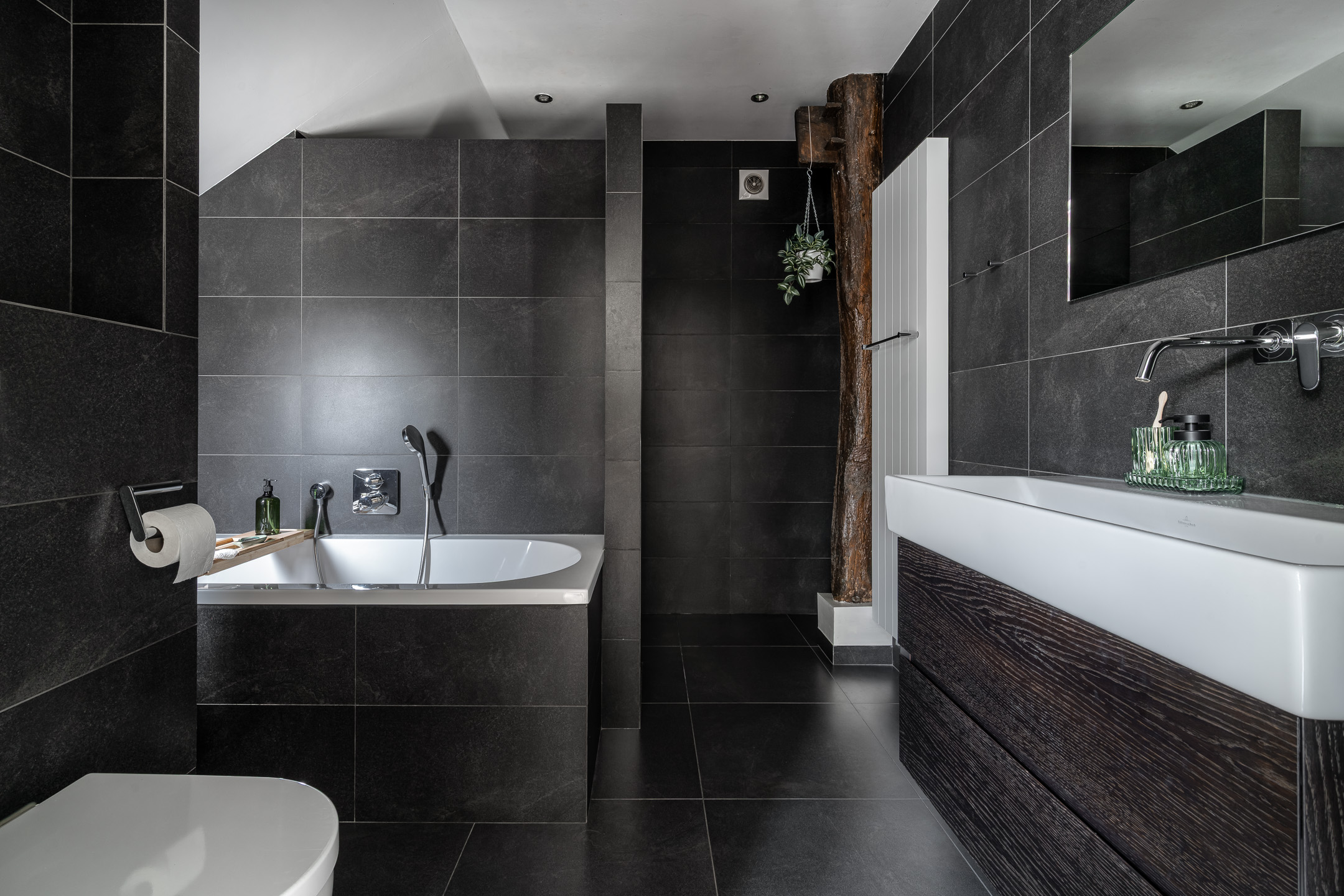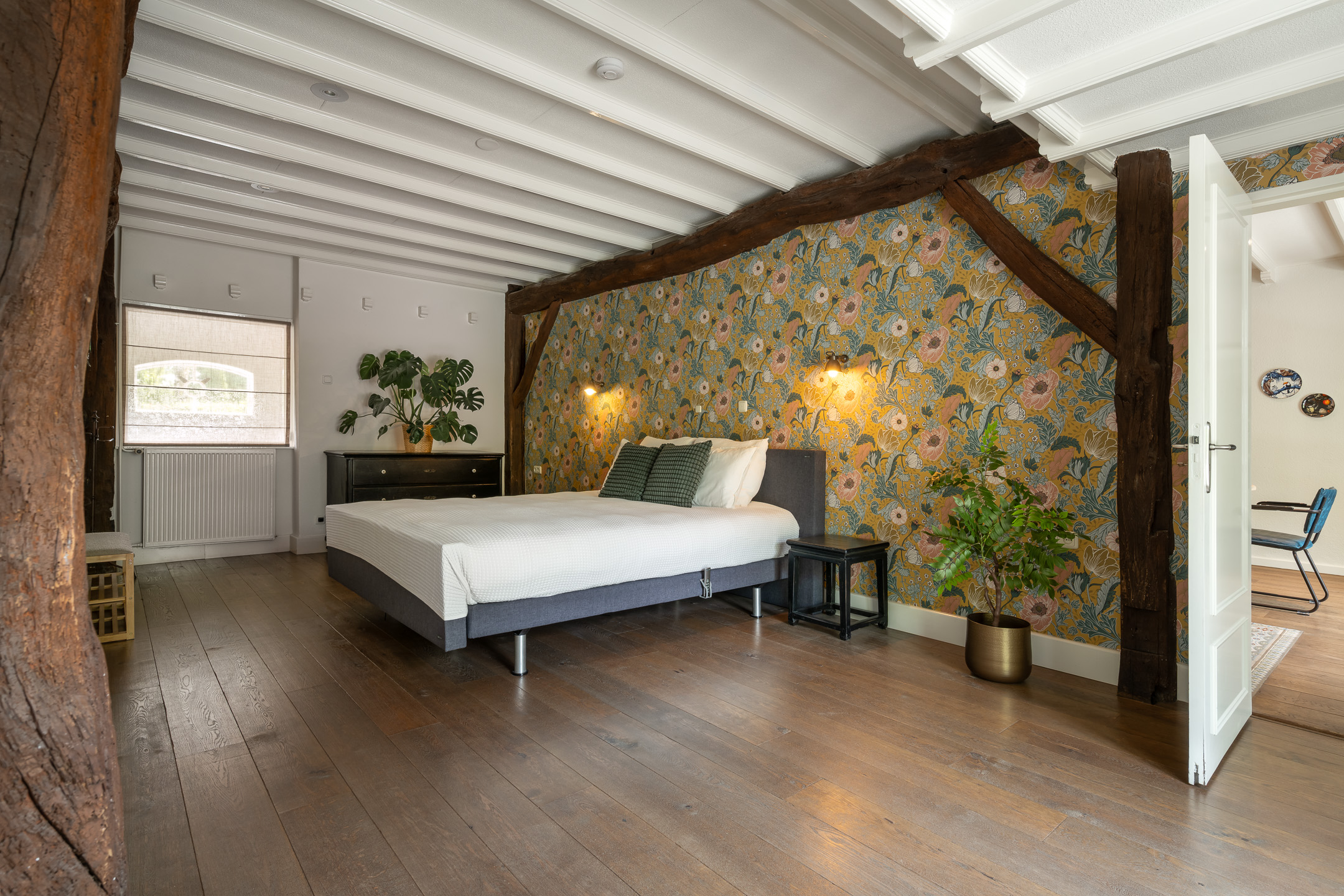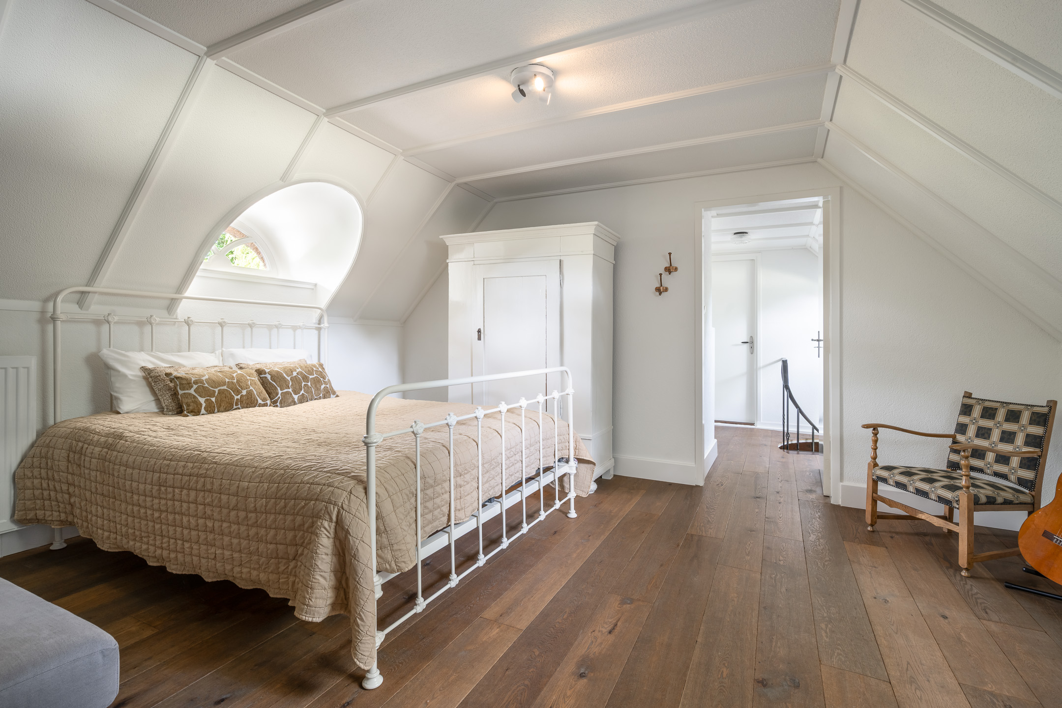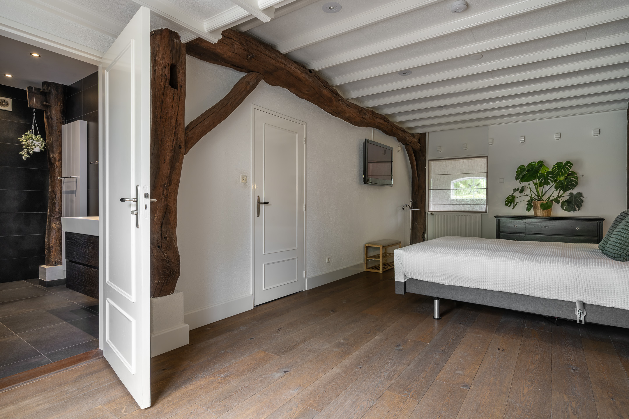 Slaapkamer: Een royale slaapkamer met ook hier de traditionele houten balken. Een praktische inloopkast en de badkamer zijn hiernaast gelegen. De moderne badkamer op de begane grond is met ligbad, inloopdouche, dubbele wastafel en met meubel voorzien.