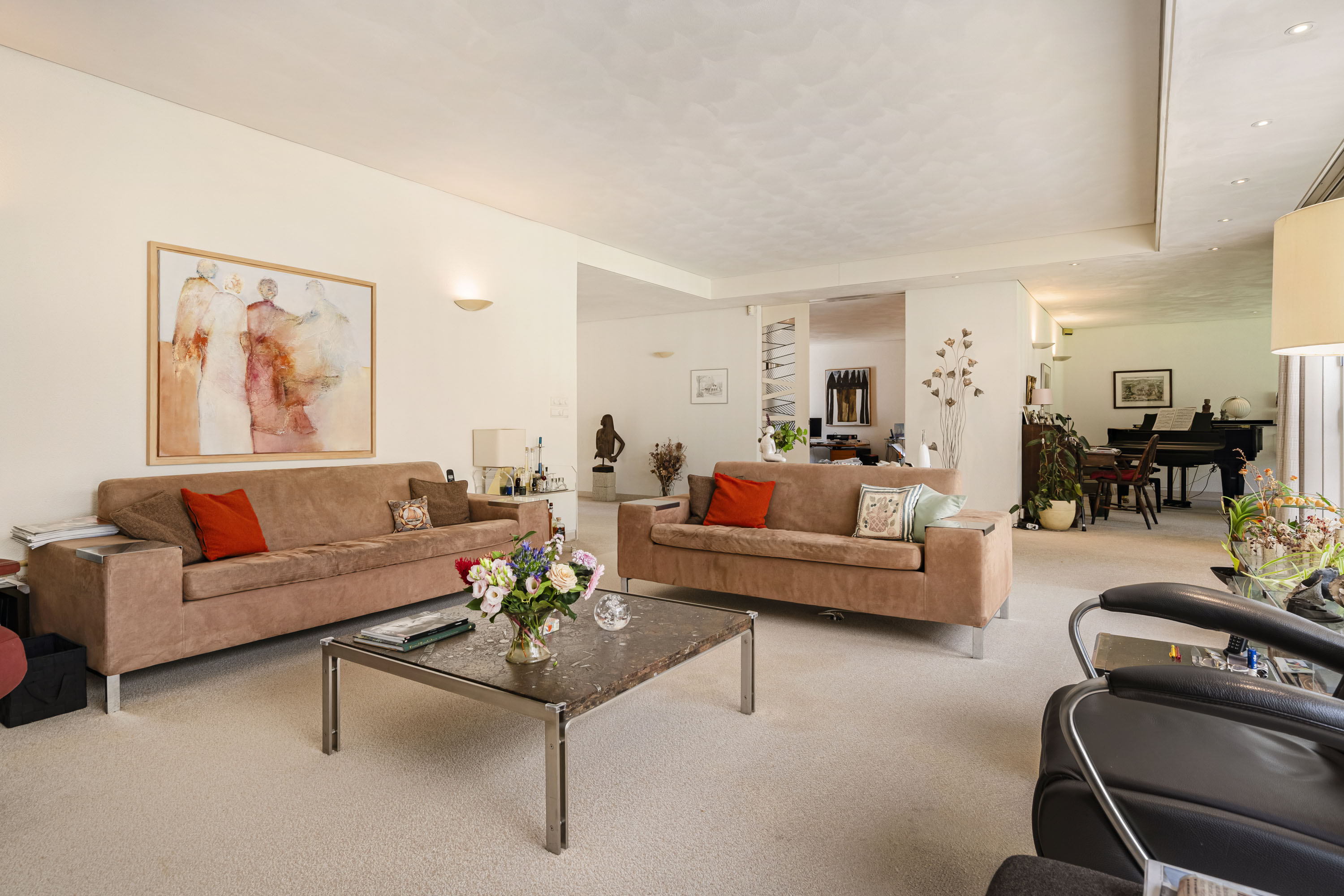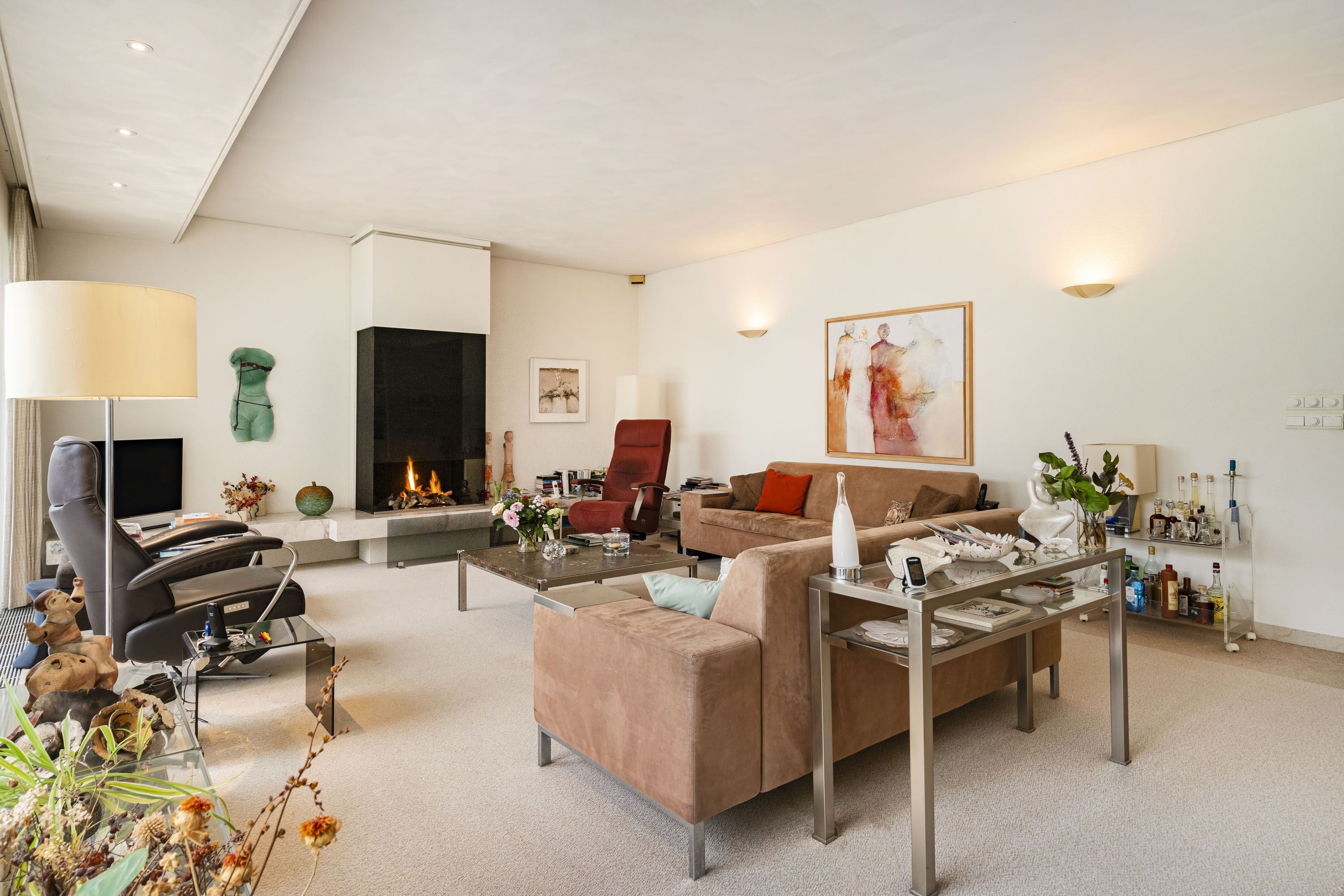 Als we verder gaan op de begane grond komen we in het zeer royale woongedeelte. De zitkamer beschikt over een glazen pui over de gehele breedte, waardoor er werkelijk een fantastisch uitzicht is over de tuin. Verder is er een leefkeuken met een aangrenzende bijkeuken voorzien van een goederenlift vanuit het souterrain. De eetkamer is gesitueerd aan de tuinzijde en daartussen bevindt zich een royale werkkamer. Al deze ruimten in het woongedeelte staan in open verbinding met elkaar. Werkkamer en keuken kunnen met fraaie schuifdeuren afgescheiden worden. Het royale overdekte buitenterras grenzend aan de zitkamer is voorzien van een elektrisch schuifdak inclusief zonwering en heeft haar toegang vanuit de zitkamer middels een schuifpui.