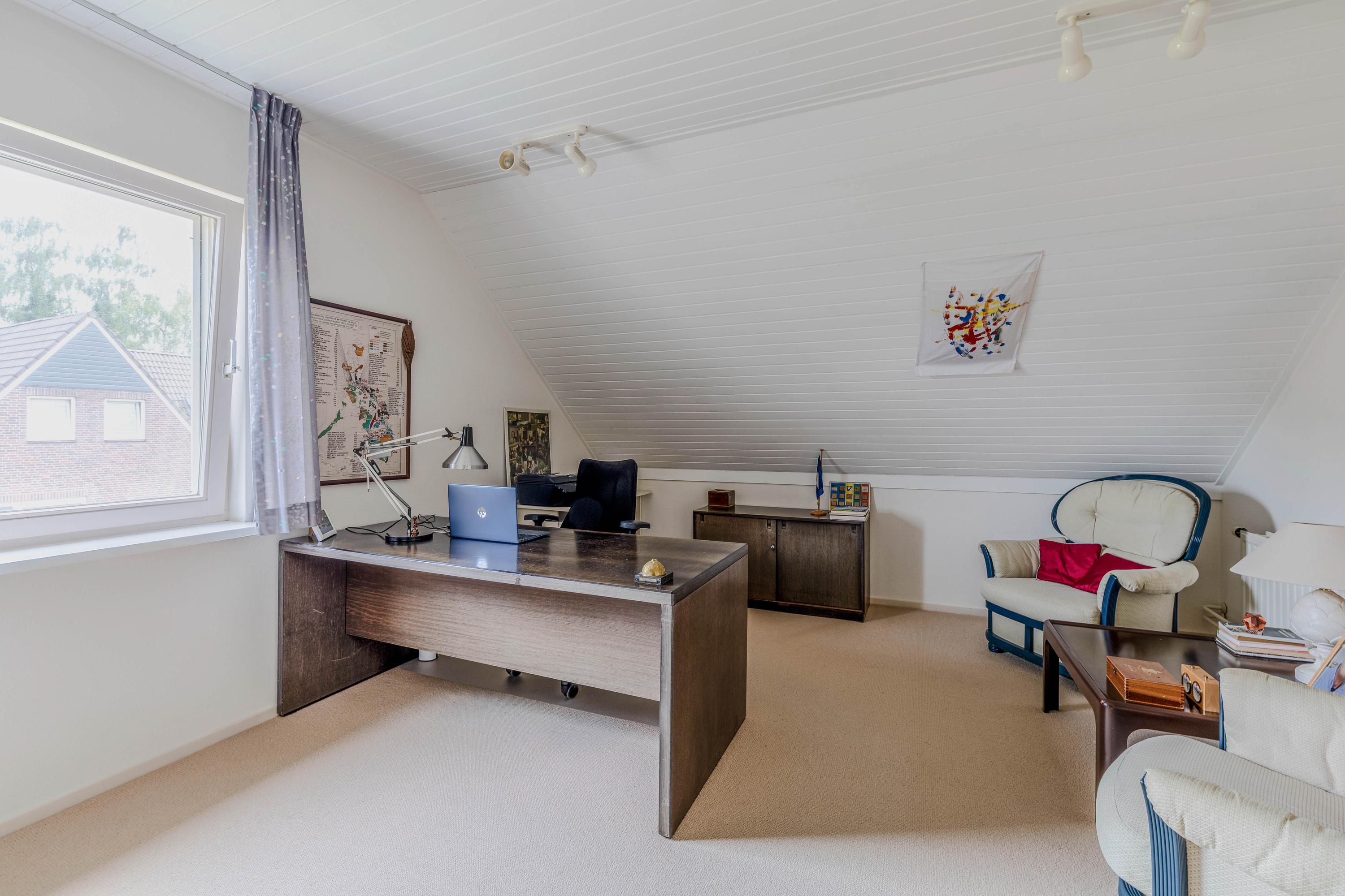 Grote bergzolder met meerdere ruimtes bereikbaar vanuit de overloop van de 1ste verdieping door middel van een vlizotrap.