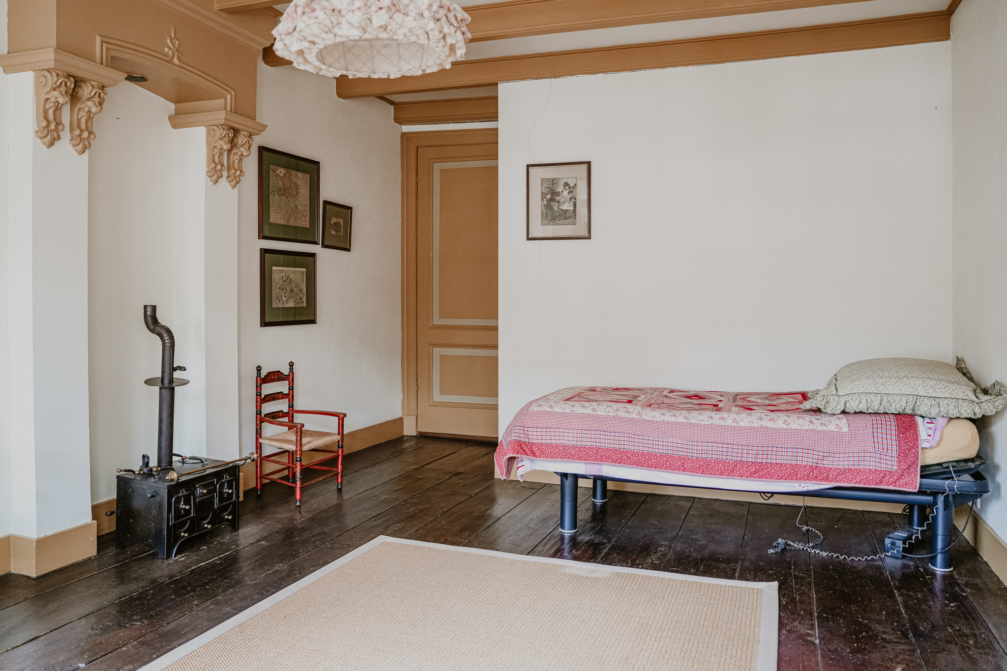 Op deze verdieping bevinden zich nog twee slaapkamers, beide met brede vloerdelen, balkenplafonds en roederamen. De badkamer is ingericht met een ligbad, douchecabine, wastafel en toilet.