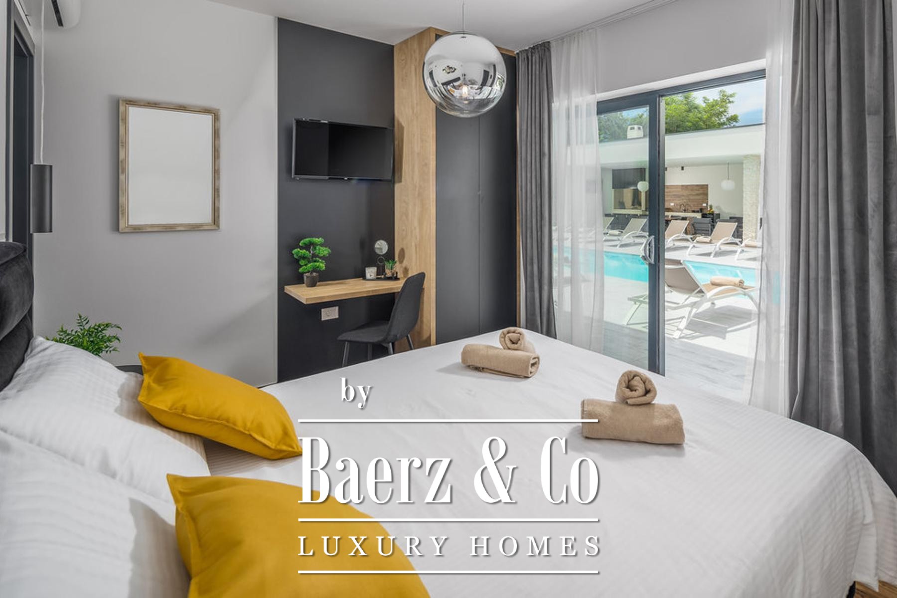 bathroom, and each room has direct access to its own terrace with a beautiful view of nature.On the plot there is a sunbathing area, a heated pool with a heat pump with a total size of 38.50 m2, and a covered area with a barbecue and a place to dine with your loved ones.The best materials and equipment were used for this property, high quality construction, aluminum joinery, underfloor heating system through a heat pump. All rooms are air-conditioned. First-class parquet and ceramics, all furniture is designer and of well-known brands.A first-class property that deserves attention.For more information or to arrange a viewing, please feel free to contact us.